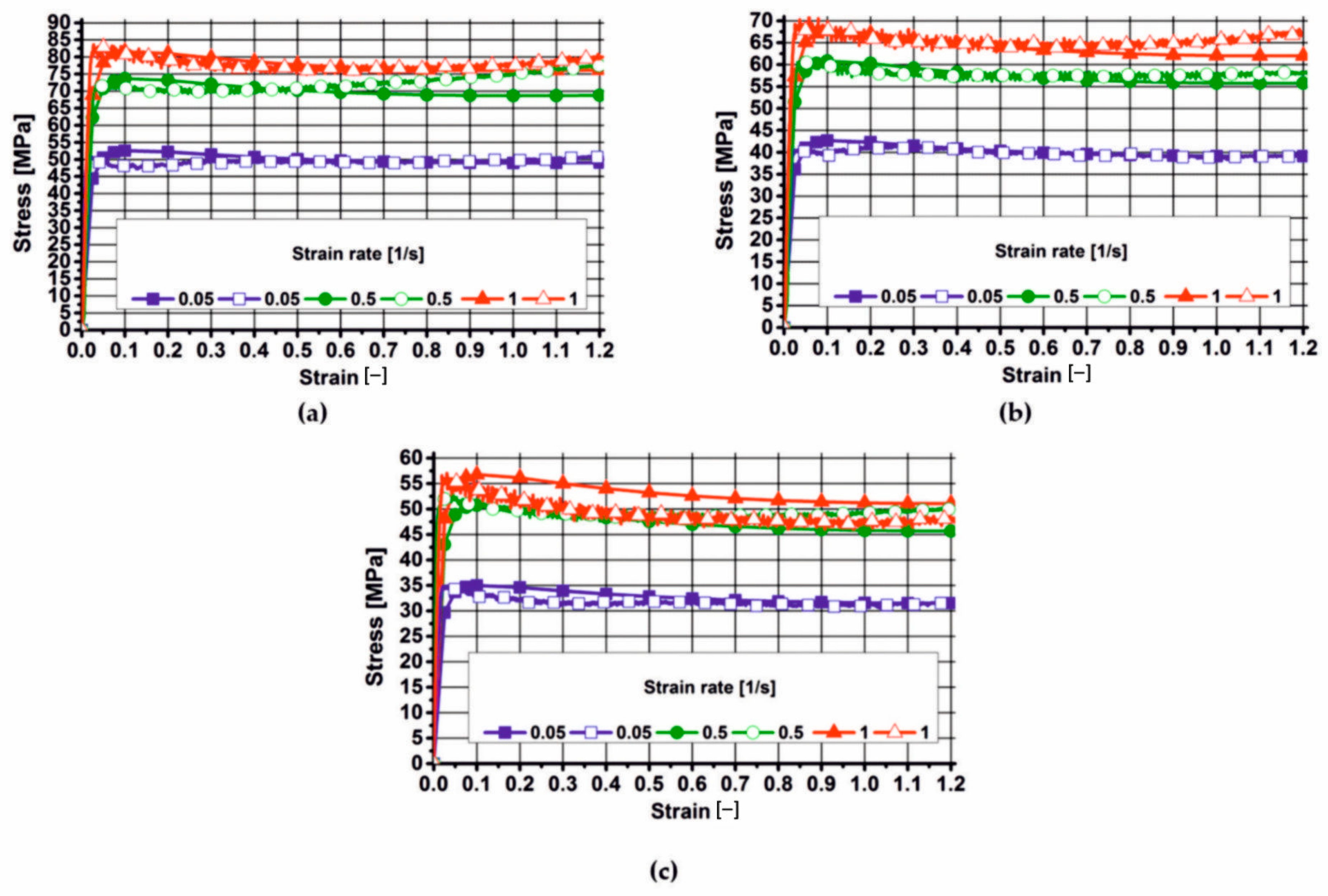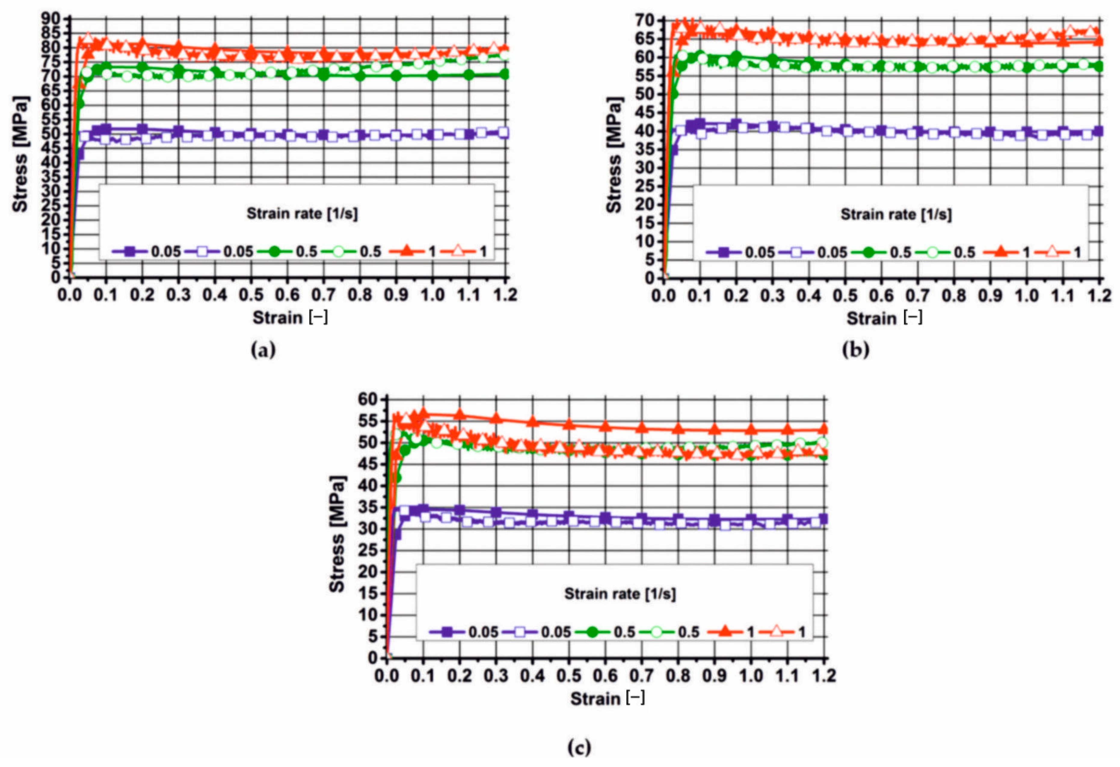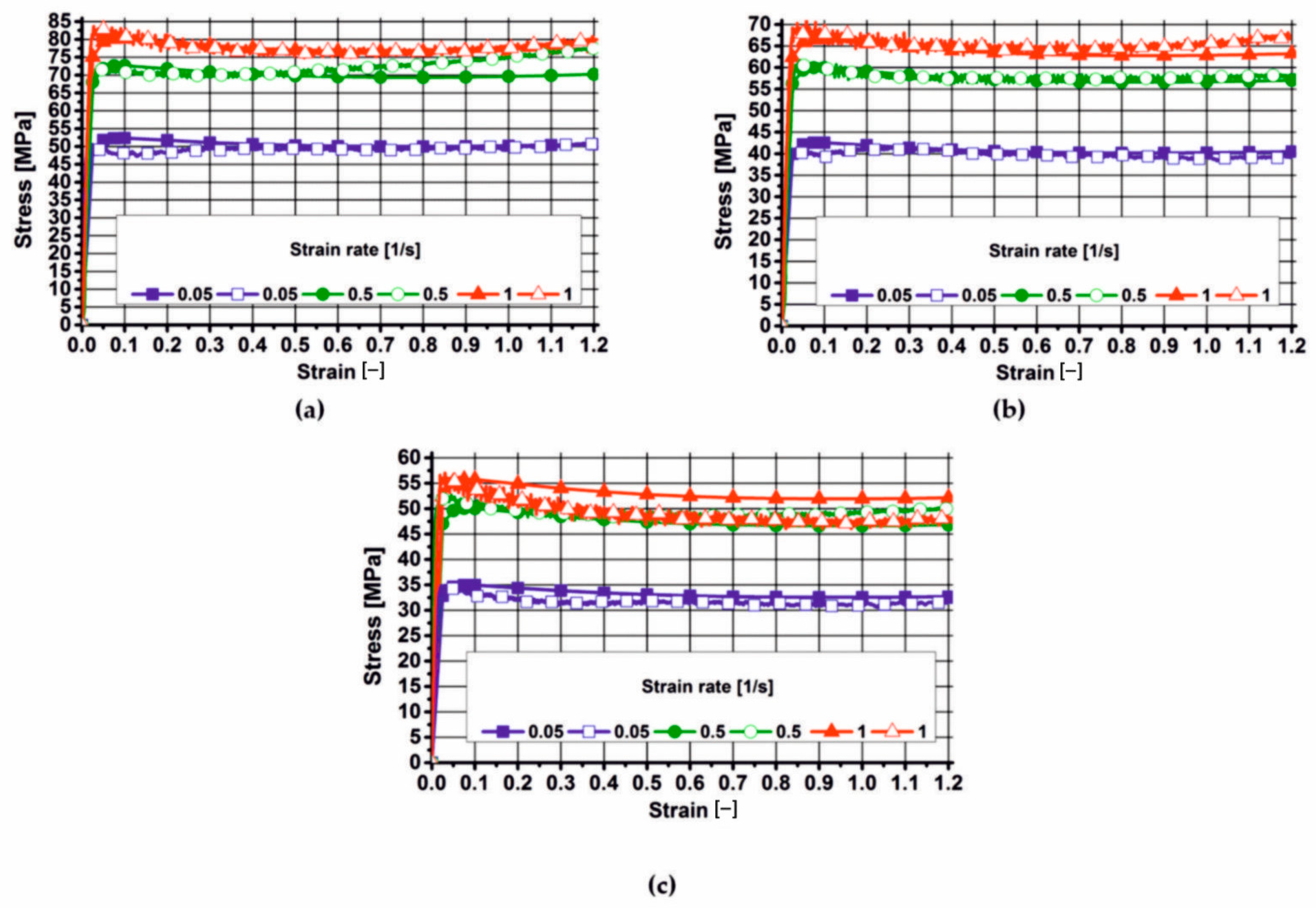 16]. For the correct determination of the rheological properties of the analysed material, it is important to take into account the influence of material temperature, strain values, and strain rate, which increase the accuracy of calculations [