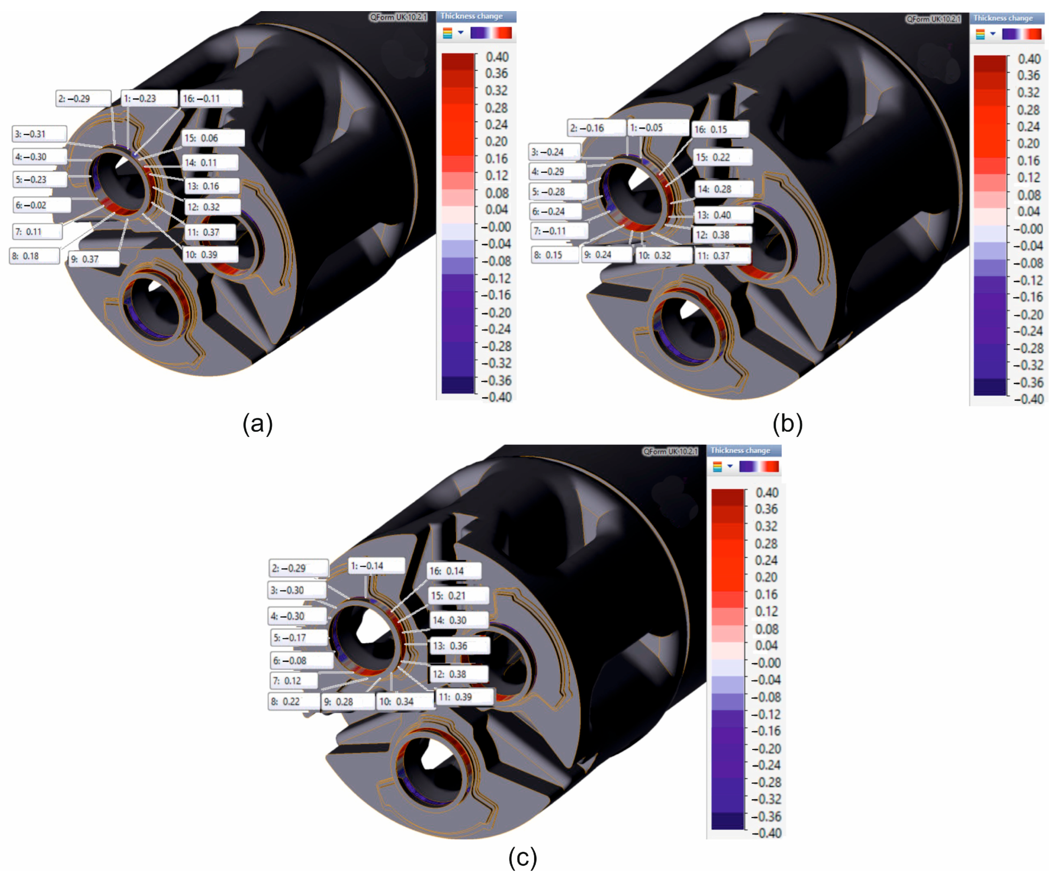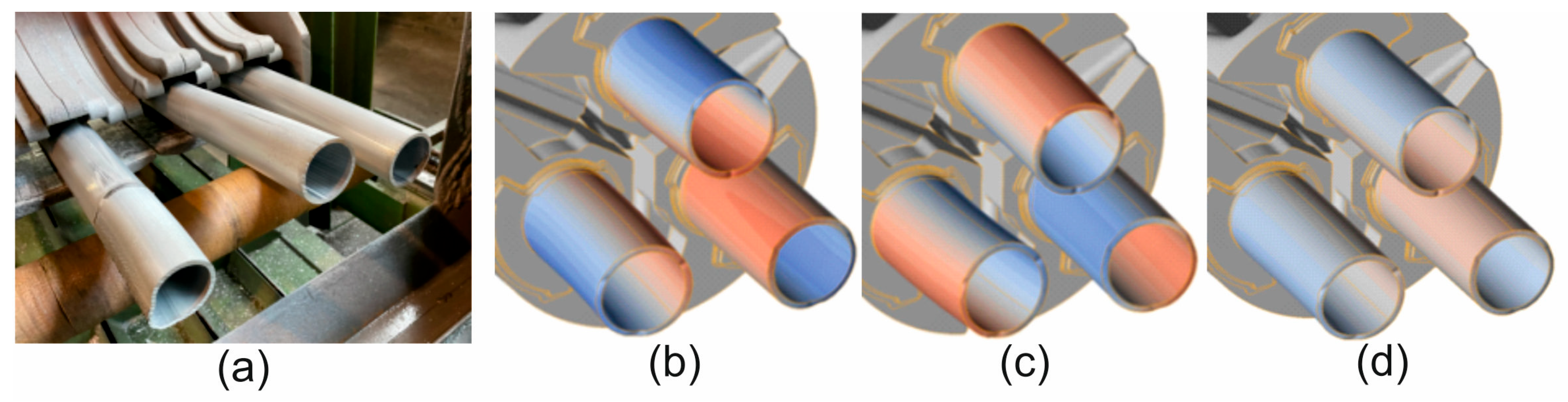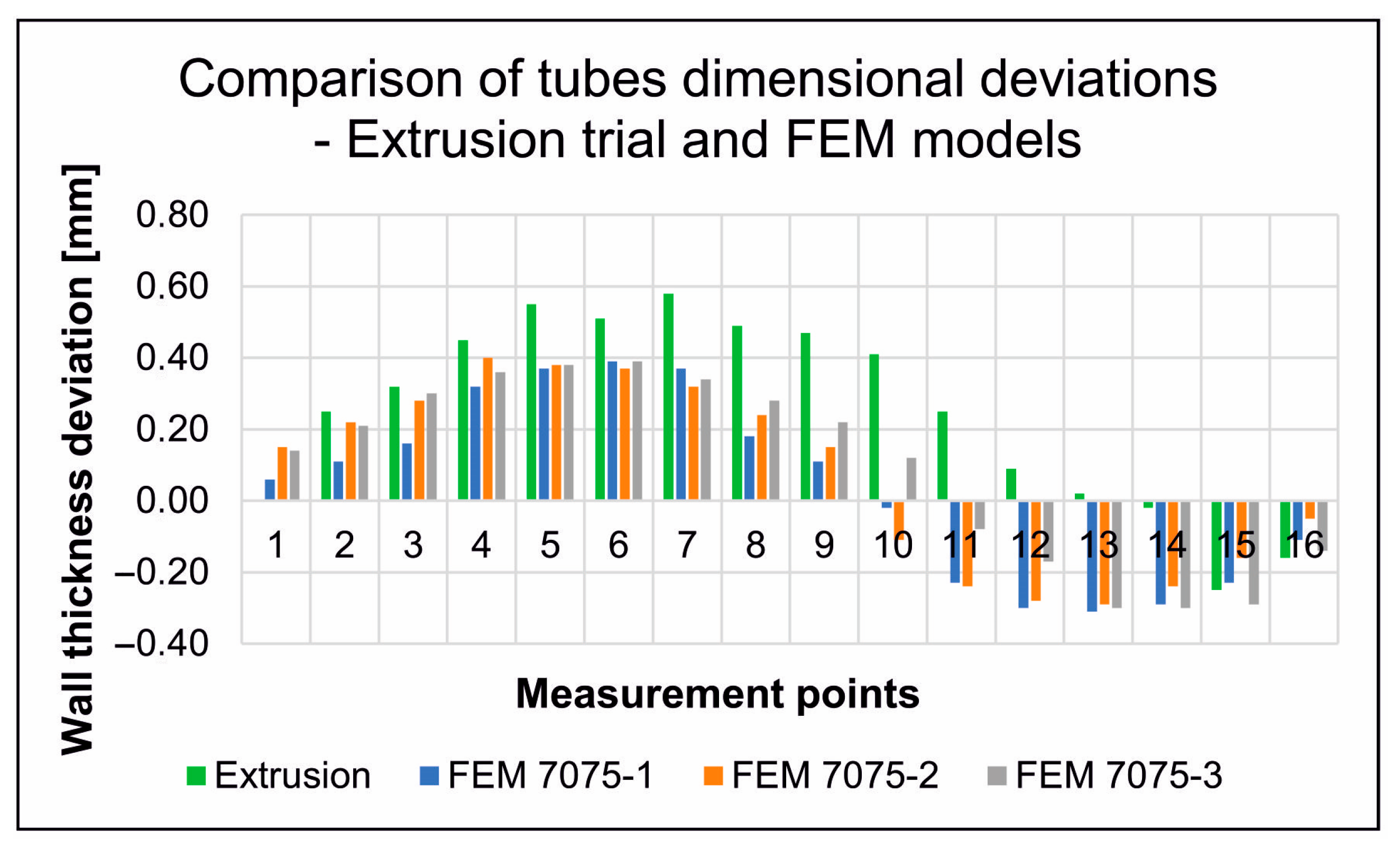 Figure 24. For each of the analysed material models, numerical FEM calculations of the hot extrusion process revealed significant variations in the wall thickness of the 7075 aluminium alloy tubes, with a high positive dimensional deviation of +0.41 mm and a high negative dimensional deviation of −0.31 mm. However, positive wall thickness deviations clearly predominate on the circumference of the extruded tubes. In