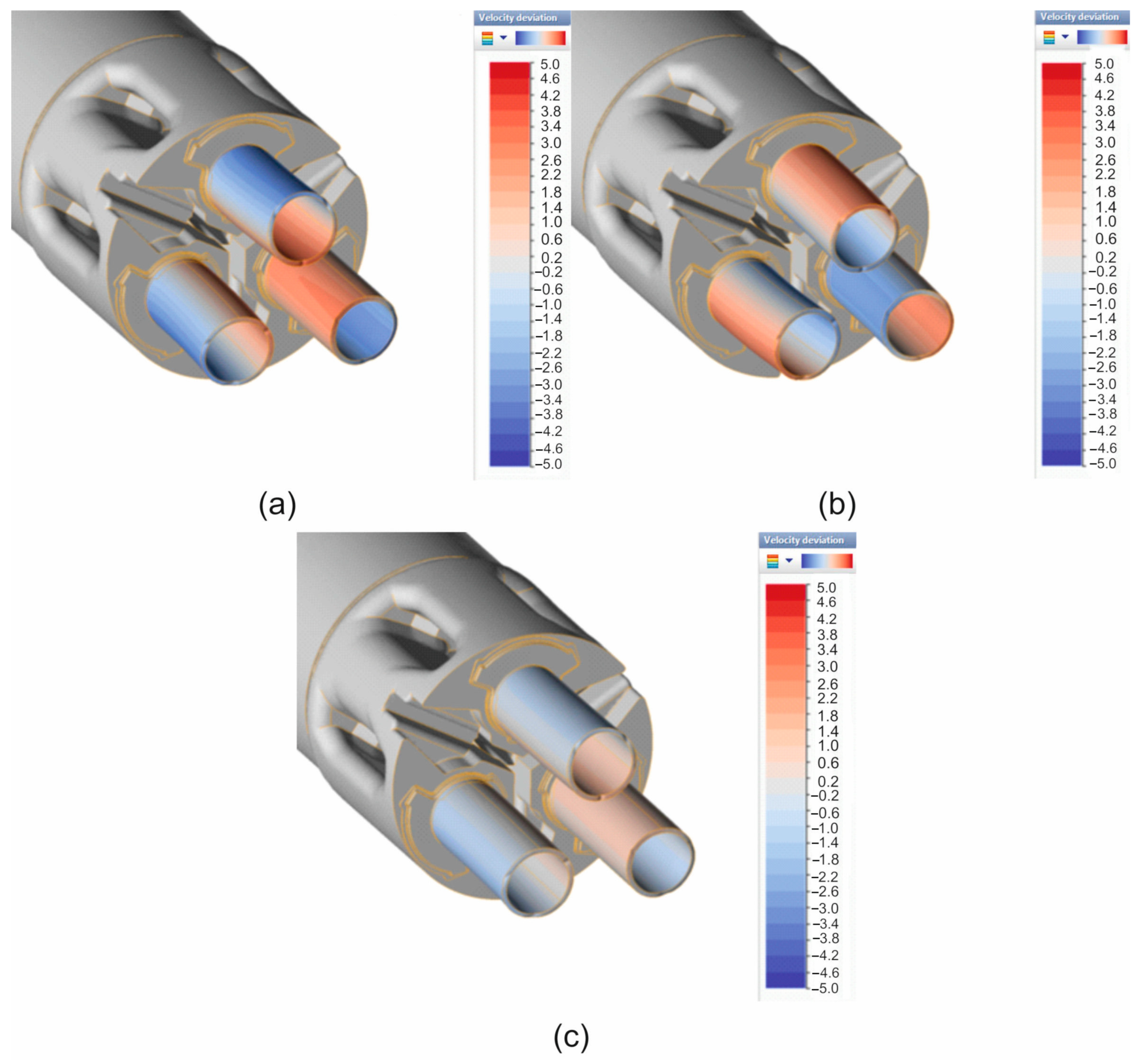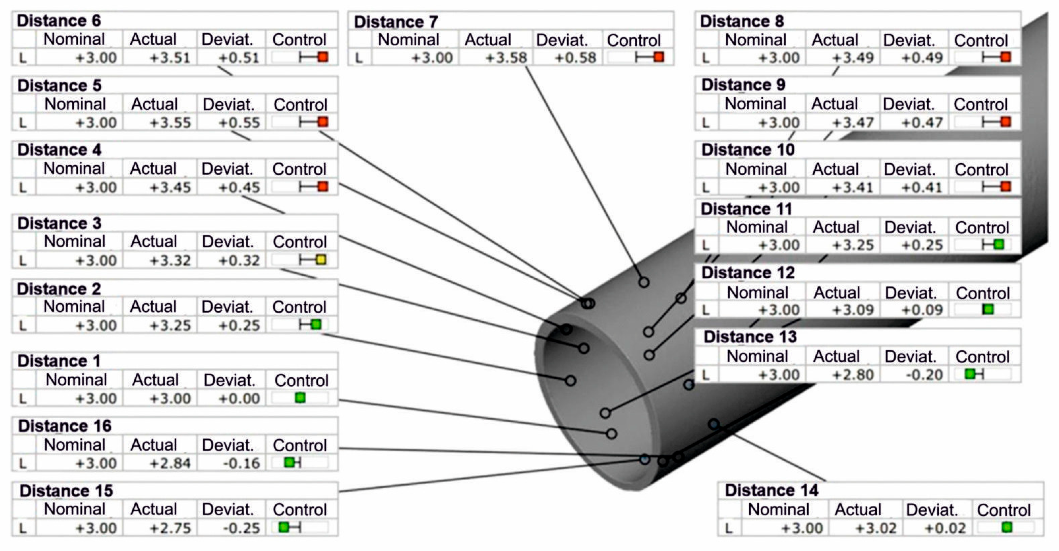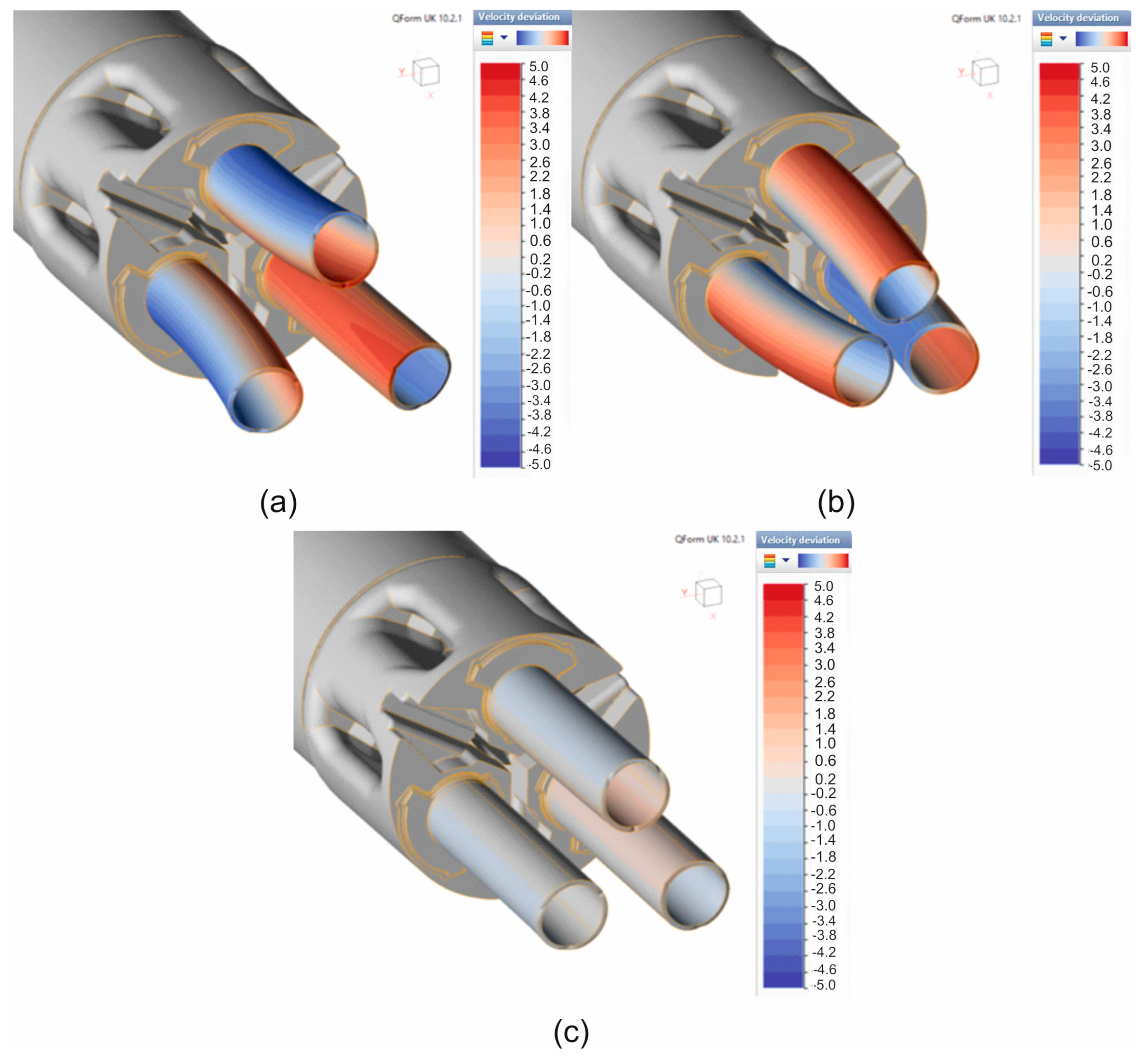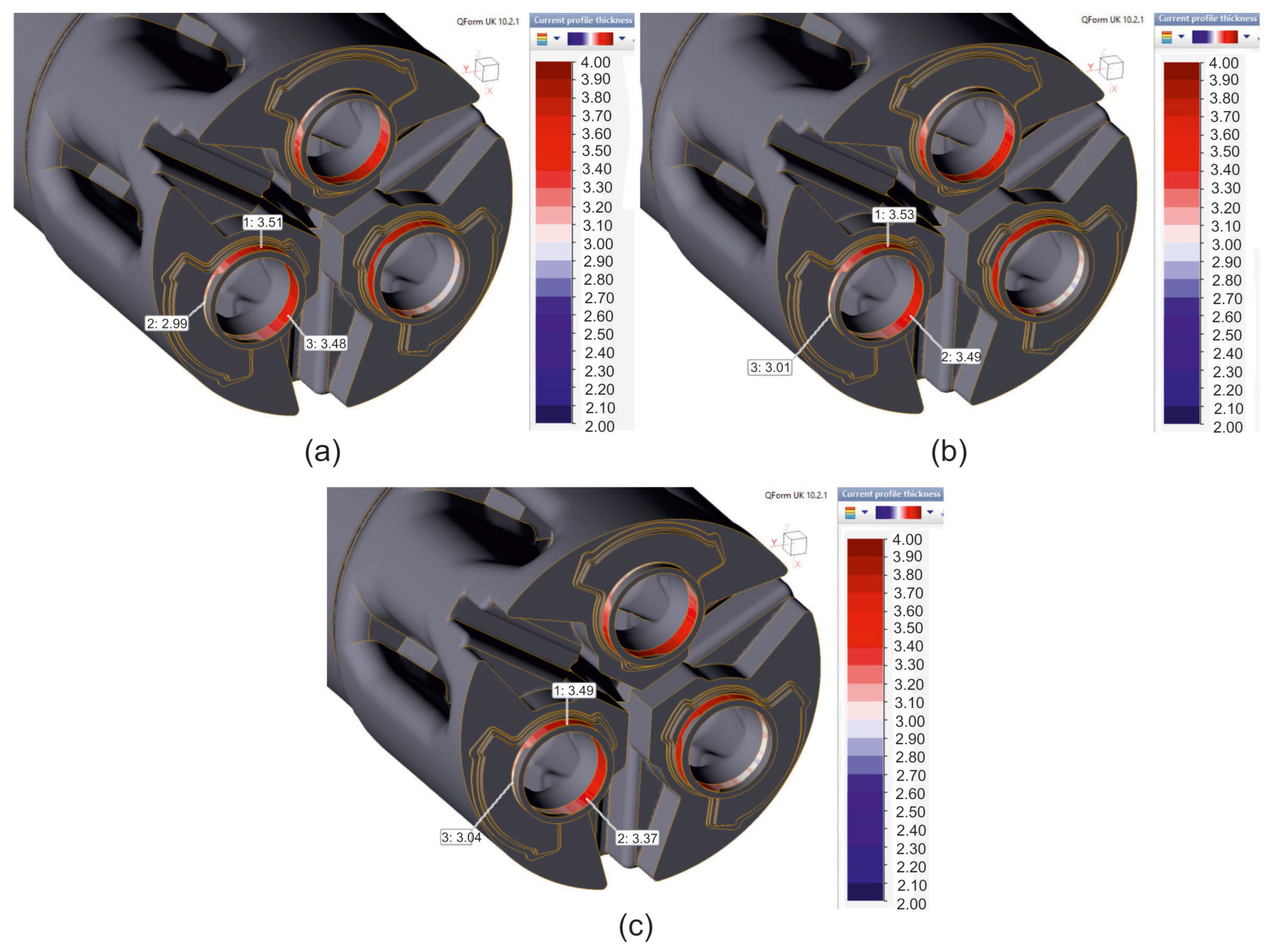 Figure 24. For each of the analysed material models, numerical FEM calculations of the hot extrusion process revealed significant variations in the wall thickness of the 7075 aluminium alloy tubes, with a high positive dimensional deviation of +0.41 mm and a high negative dimensional deviation of −0.31 mm. However, positive wall thickness deviations clearly predominate on the circumference of the extruded tubes. In