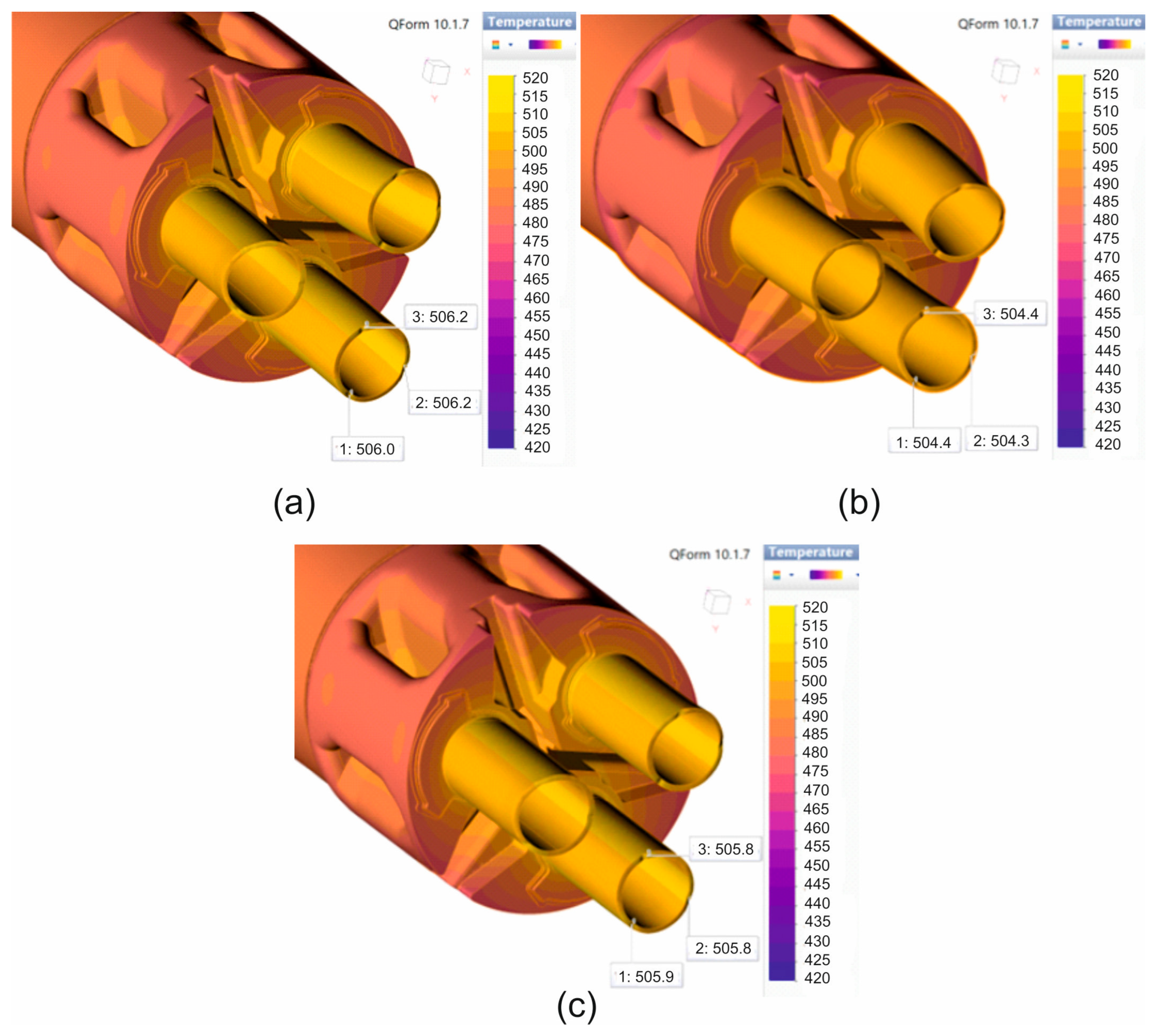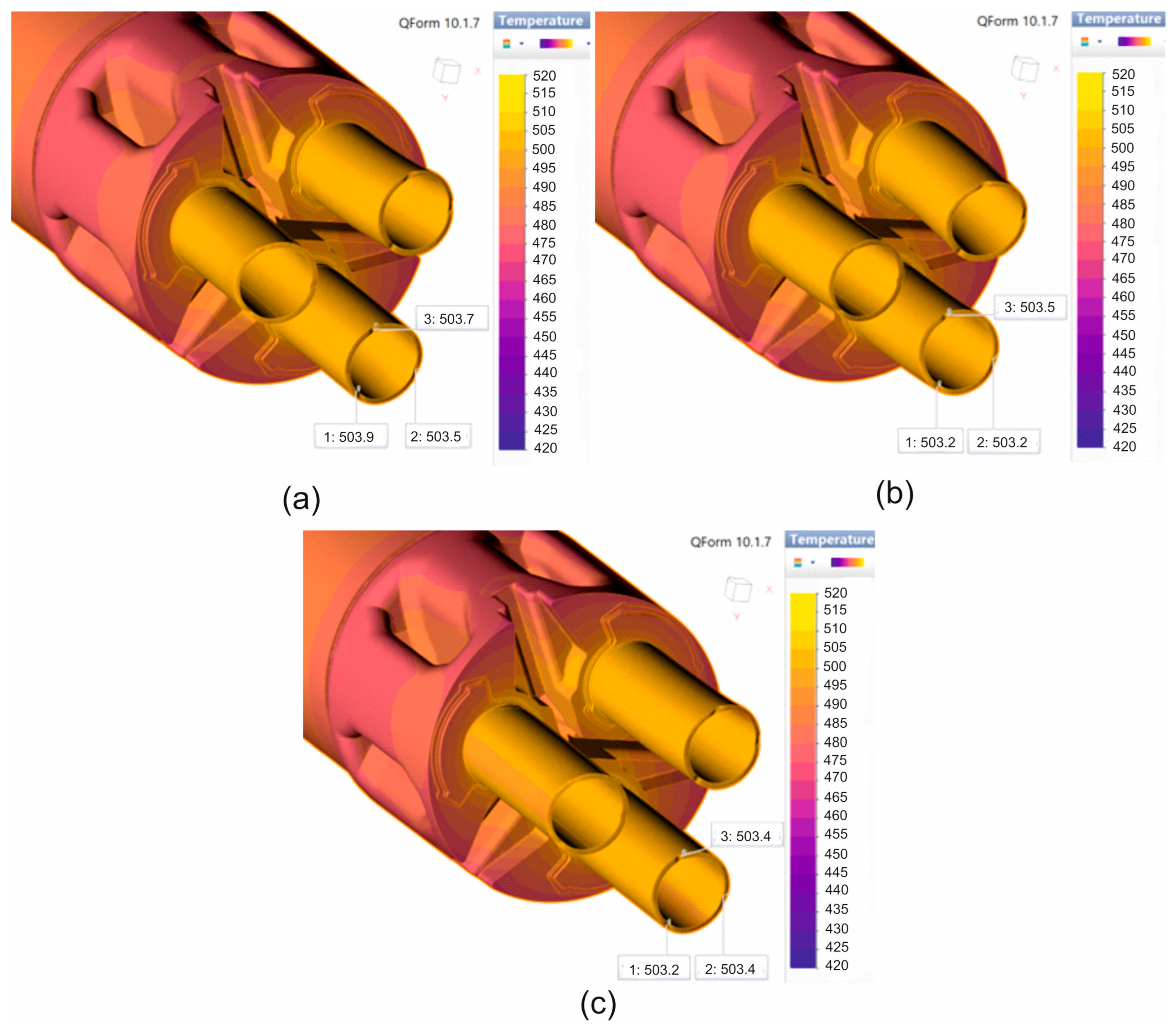 Figure 21a,c) and test results from the industrial extrusion process of the Ø50 × 3 mm tubes in question on porthole dies for different billet heating temperatures of 480 °C and 510 °C (