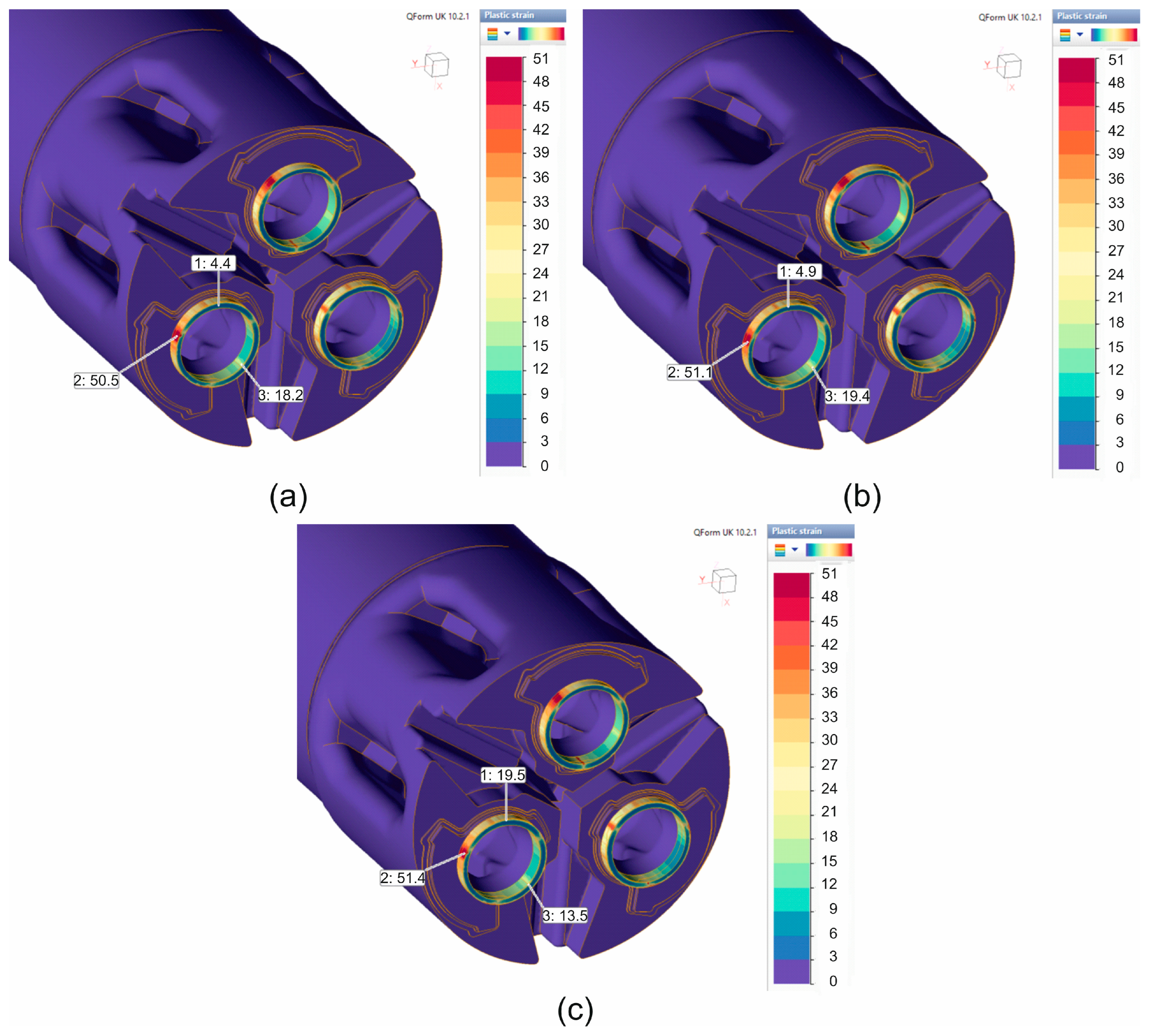 Figure 28) shows the accuracy of reflecting the actual state of process and product parameters using FEM numerical calculations with the assignment of appropriate coefficients from the Hensel–Spittel equation for individual material models and their impact on plastic strain.