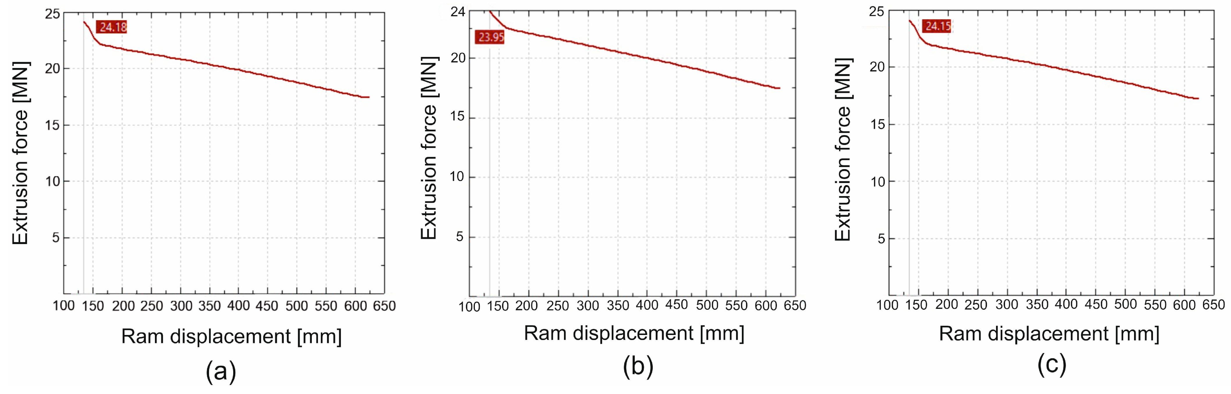 Figure 27. In general, the maximum extrusion force values from industrial trials are very similar to those obtained in the FEM calculations for the three different material models used. For a billet heating temperature of 480 °C, the maximum extrusion force obtained from FEM numerical calculations that was closest to the corresponding maximum value from the real extrusion process was obtained from material model no. 2 (23.95 MN in FEM and 23.70 MN in real extrusion process: