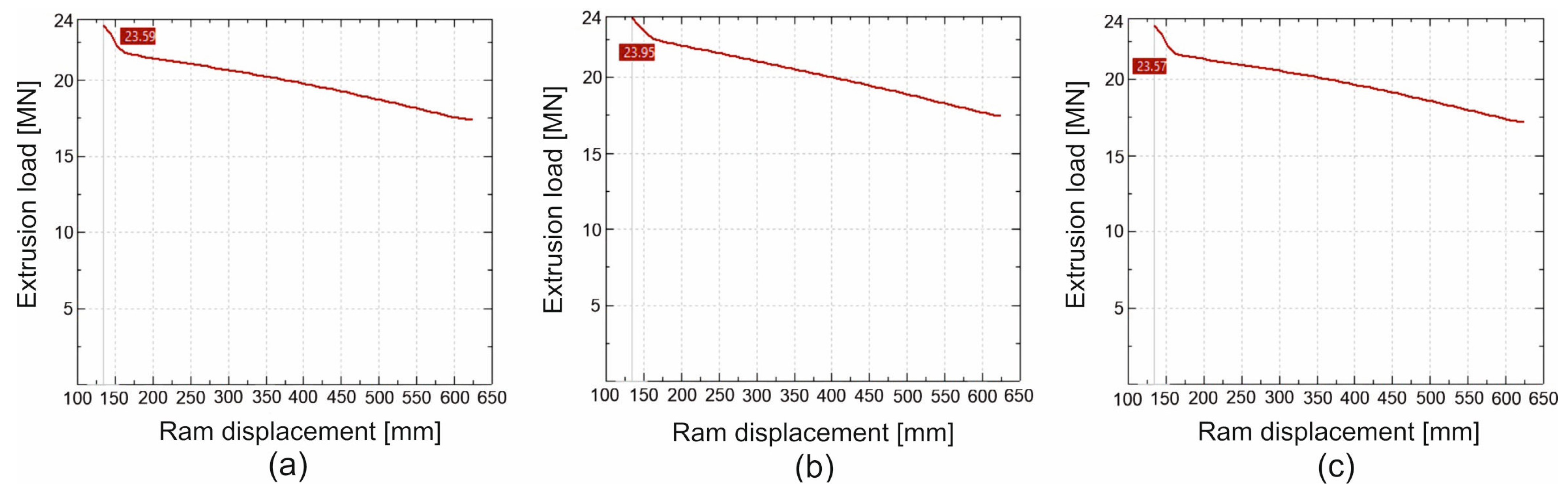 Figure 27 upper). Similarly, with regard to the minimum extrusion force obtained as a result of FEM numerical calculations, the closest value to the corresponding minimum value from the real extrusion process refers to material model no. 2 (16.70 MN in FEM, while 14.2 MN in the real extrusion process). It is important to note the slight difference in the values of the predicted FEM maximum extrusion force for individual material models, which amounts to only 2.5%. Slightly lower extrusion force values, but also very similar to those from the FEM calculations for the three different material models, were obtained for a higher billet heating temperature of 510 °C (