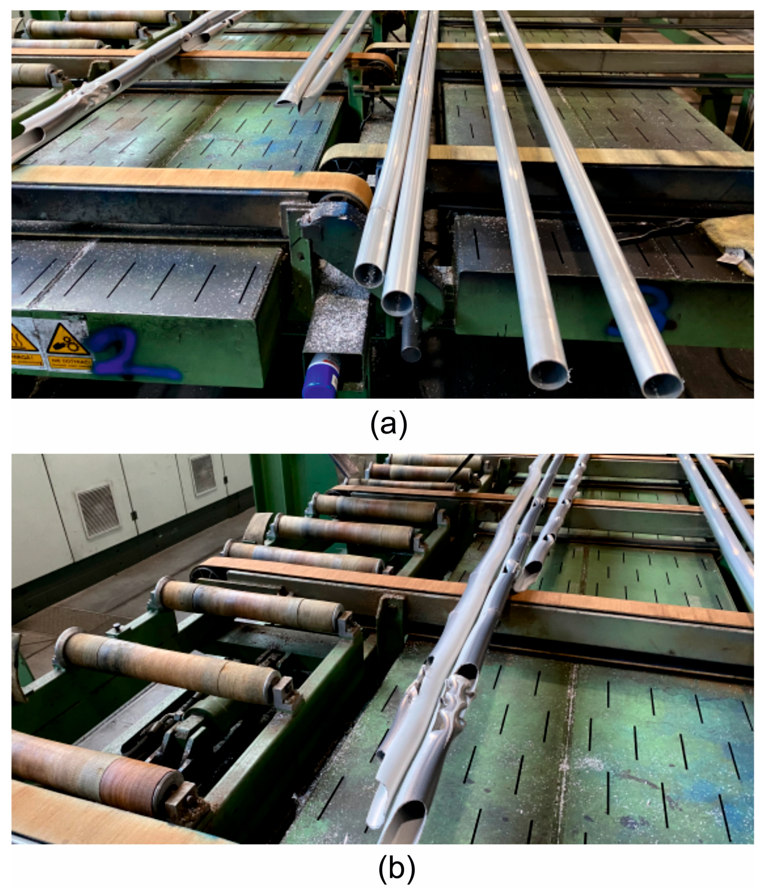 −1, so at such deformation speeds, at an extrusion temperature of 510 °C, a loss of material cohesion and a sharp drop in plastic flow stress can be expected. This is confirmed by the image of the extruded tubes in question for a billet heating temperature of 510 °C, where numerous surface cracks and transverse and longitudinal tears in the tubes can be observed, resulting precisely from the loss of material cohesion after exceeding the limit temperature (