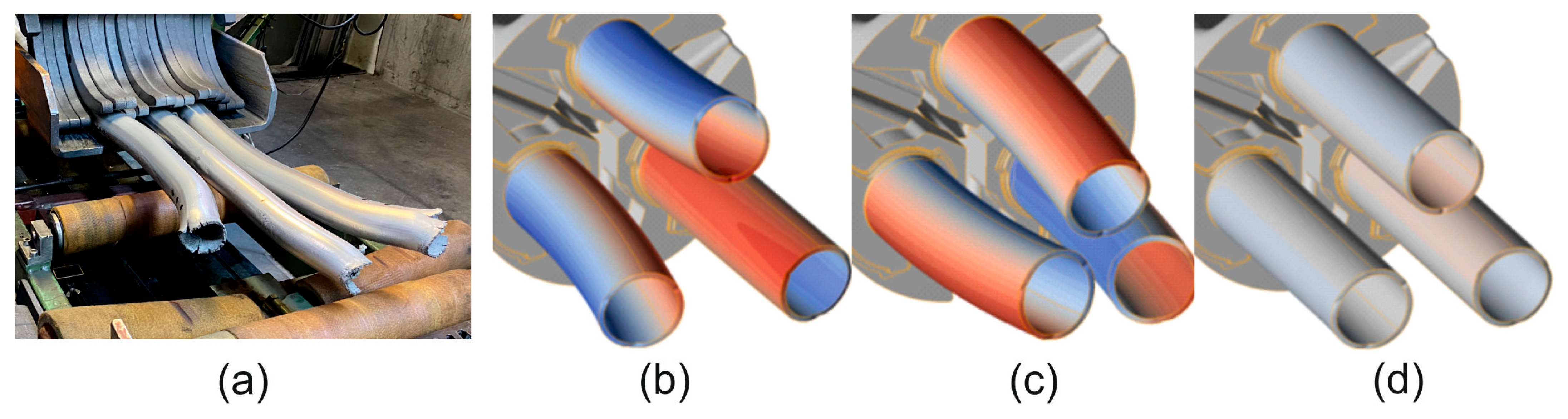 Figure 23. As can be seen, the greatest similarity in the manner in which metal flows out of the die opening and, consequently, in the geometric stability of the extruded tubes occurs for material model no. 1 for both analysed ingot heating temperatures. In particular, a high degree of consistency can be observed between the FEM calculation results for material model no. 1 and the actual extrusion process for a higher billet heating temperature of 510 °C, where a fairly strong outward bending of the extruded tubes is observed, indicating a faster metal flow in the central segment of the die. In stark contrast to material model no. 1, material model no. 2 indicates a completely different flow of metal from the die opening, resulting in a strong inward bend of the extruded tubes. In the case of material model no. 3, for a billet heating temperature of 510 °C, we obtain uniform flow and a geometrically simple product, which is not reflected in reality. For a lower heating temperature of 480 °C, a very even flow of metal from the die holes and a geometrically stable product with slight bending of the extruded tubes towards the outside were observed during industrial tests. In principle, for all three material models analysed, a high degree of consistency between the results of the FEM numerical calculations and the extrusion tests was found, with material model no. 1 being the most favourable.
