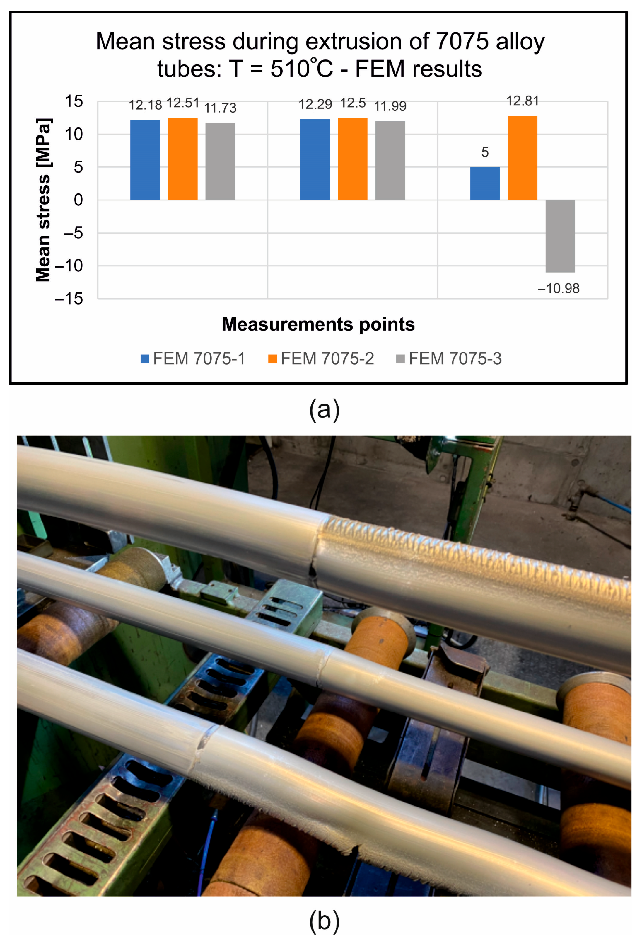 In the first segment of the extruded tubes, only tensile stresses were obtained, which are responsible for the material’s cohesion loss. In the second segment of the extruded tubes, all positive tensile stresses were again recorded, creating a risk of a loss of cohesion in the plastically formed material. Finally, in the third segment of the extruded tubes, unfavourable positive tensile stresses were observed for material models no. 1 and no. 2, with the highest positive stress close to 13 MPa for material model no. 2. and negative compressive stress for the material model no. 3.