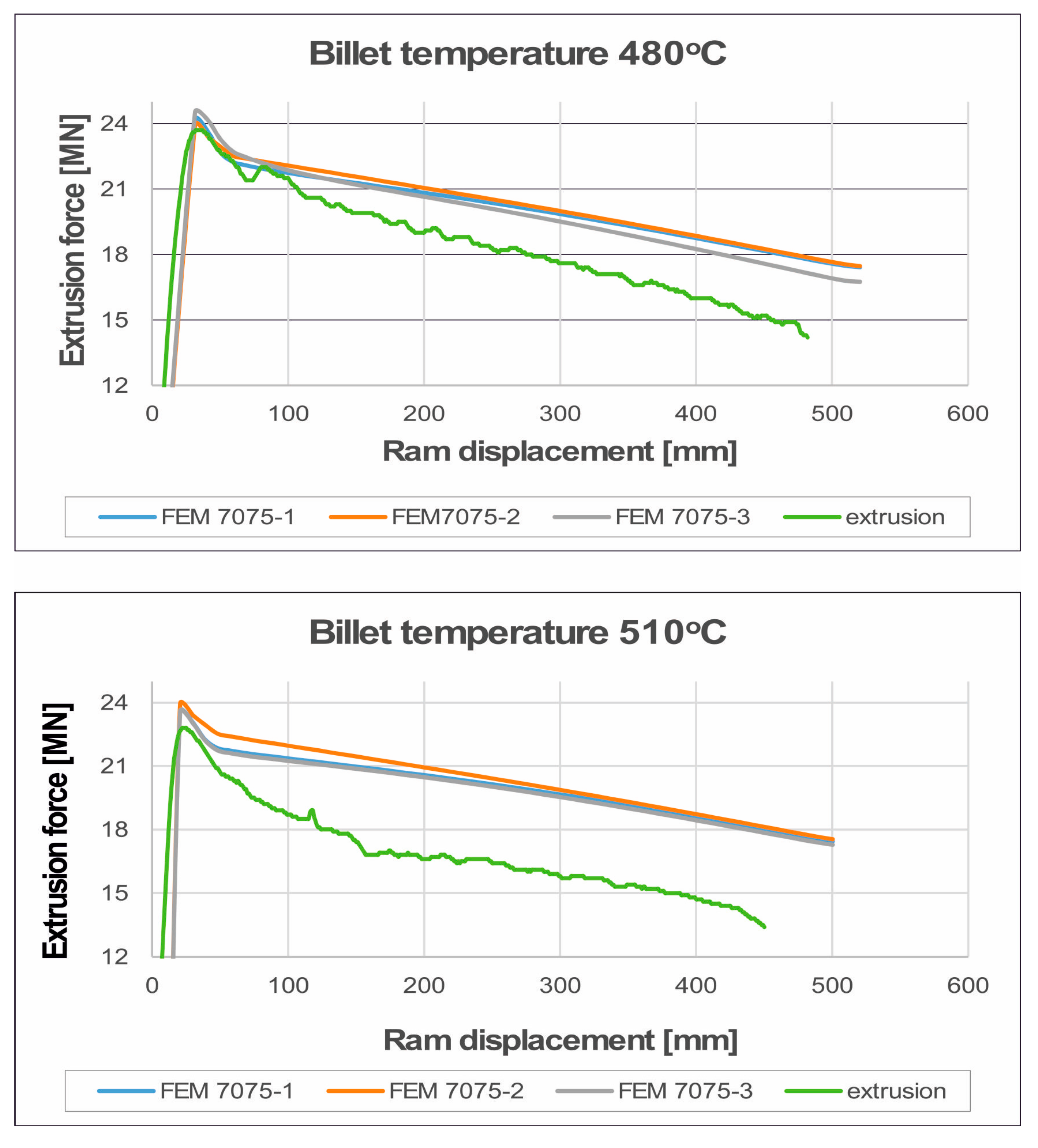 Figure 27 lower). The closest maximum extrusion force for this increased billet heating temperature was 23.57 MN for FEM and material model no. 3 and 22.80 MN for the real extrusion process. Here, we have an even smaller difference in the predicted FEM maximum extrusion force for individual material models, which was only 1.6%.