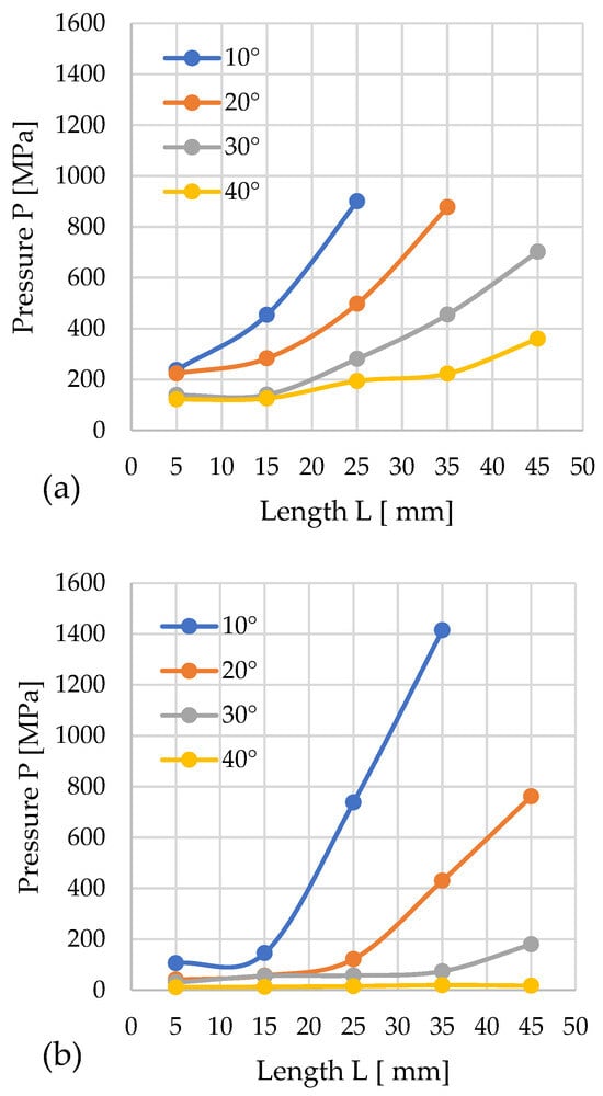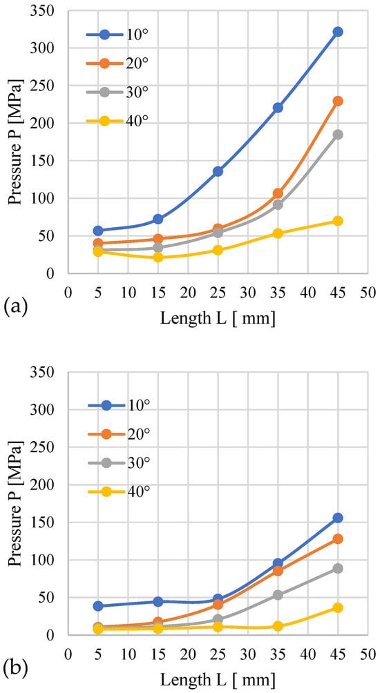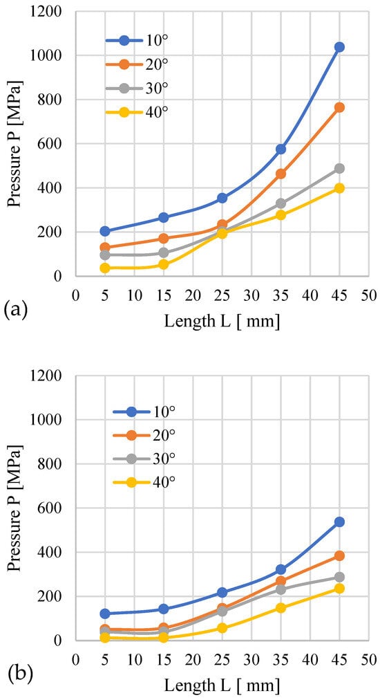 For the 10 mm diameter channel, the pressure ranged from a minimum of 7.91 MPa (α = 40°, L = 5 mm) to a maximum of 155.88 MPa (α = 10°, L = 45 mm). Furthermore, a consistent pressure increase was observed for all tested α angles once the cylindrical length exceeded L = 25 mm.