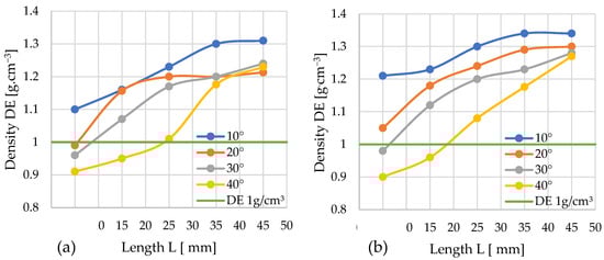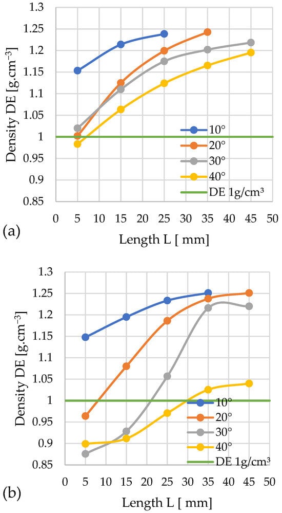 Interestingly, achieving the minimum density equivalent (DE) at the minimum pressure occurs at an angle of α = 40° (only for miscanthus and the variant with D = 12 mm, this angle is α = 30°). Therefore, for each of the tested materials, the required inlet angle α is similar, and the differences lie only in the channel length L.