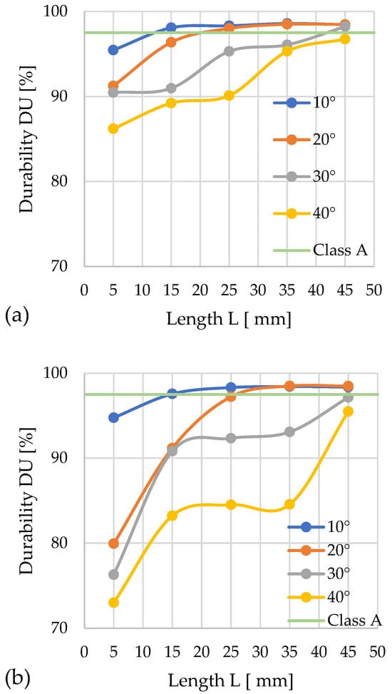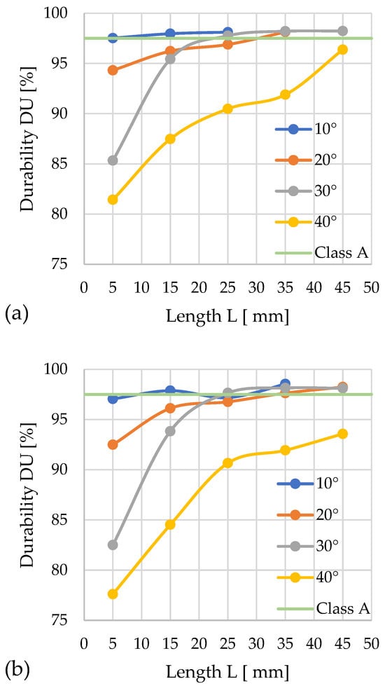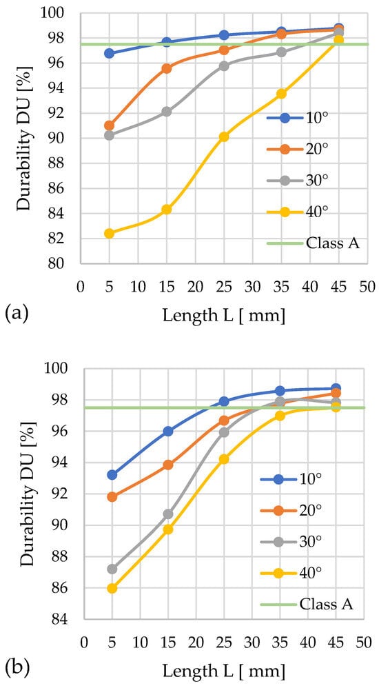 In the case of the second pellet quality indicator – DU (Durability Index), an angle of α = 40° requires higher pressure values (for miscanthus), while for silphium and sida, it does not allow us to achieve the required DU threshold, even at the maximum tested channel length L.
