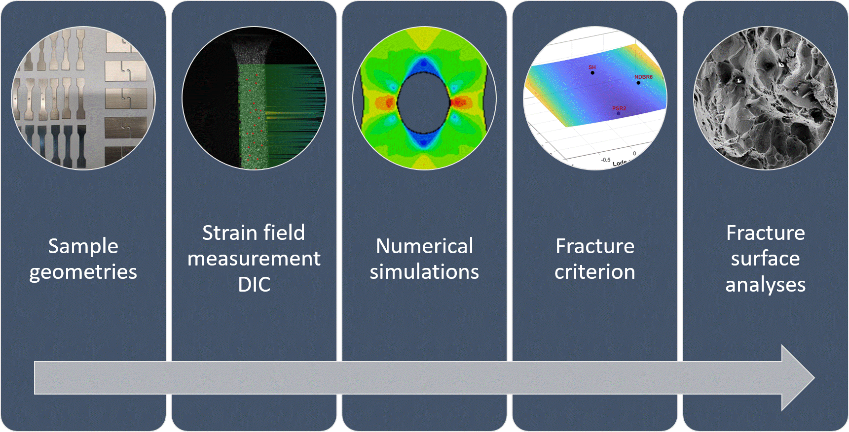 - Characterizing fracture behavior covering a wide range of stress states by conducting uniaxial tensile tests on samples with different geometries. Necking was observed in the SDB sample, which is a typical feature for ductile fracture. Shear was observed at two tips of the crack in the pure shear sample.
