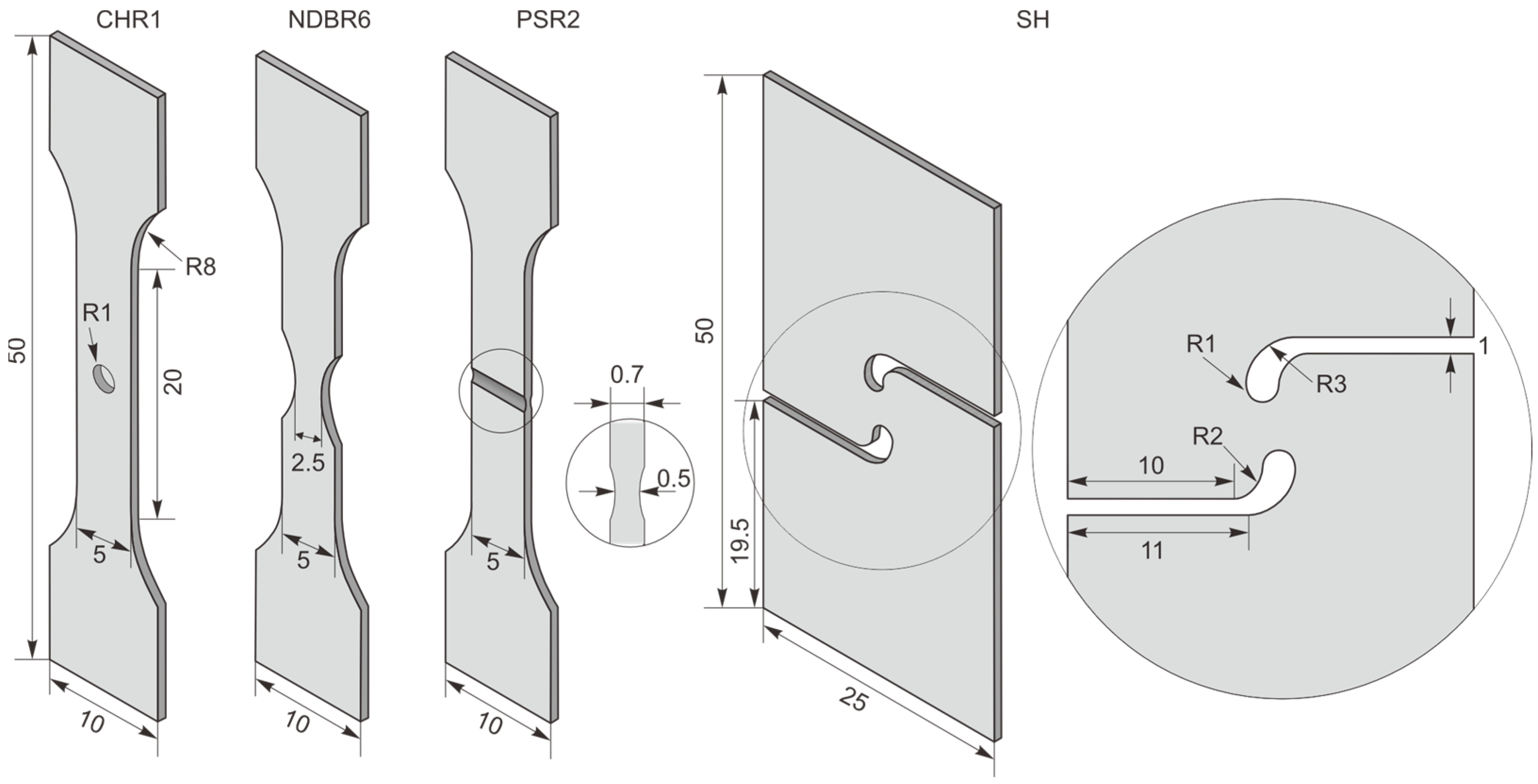 | NDBR6 | Notched-dog bone samples with a notch radius of 6 mm |
