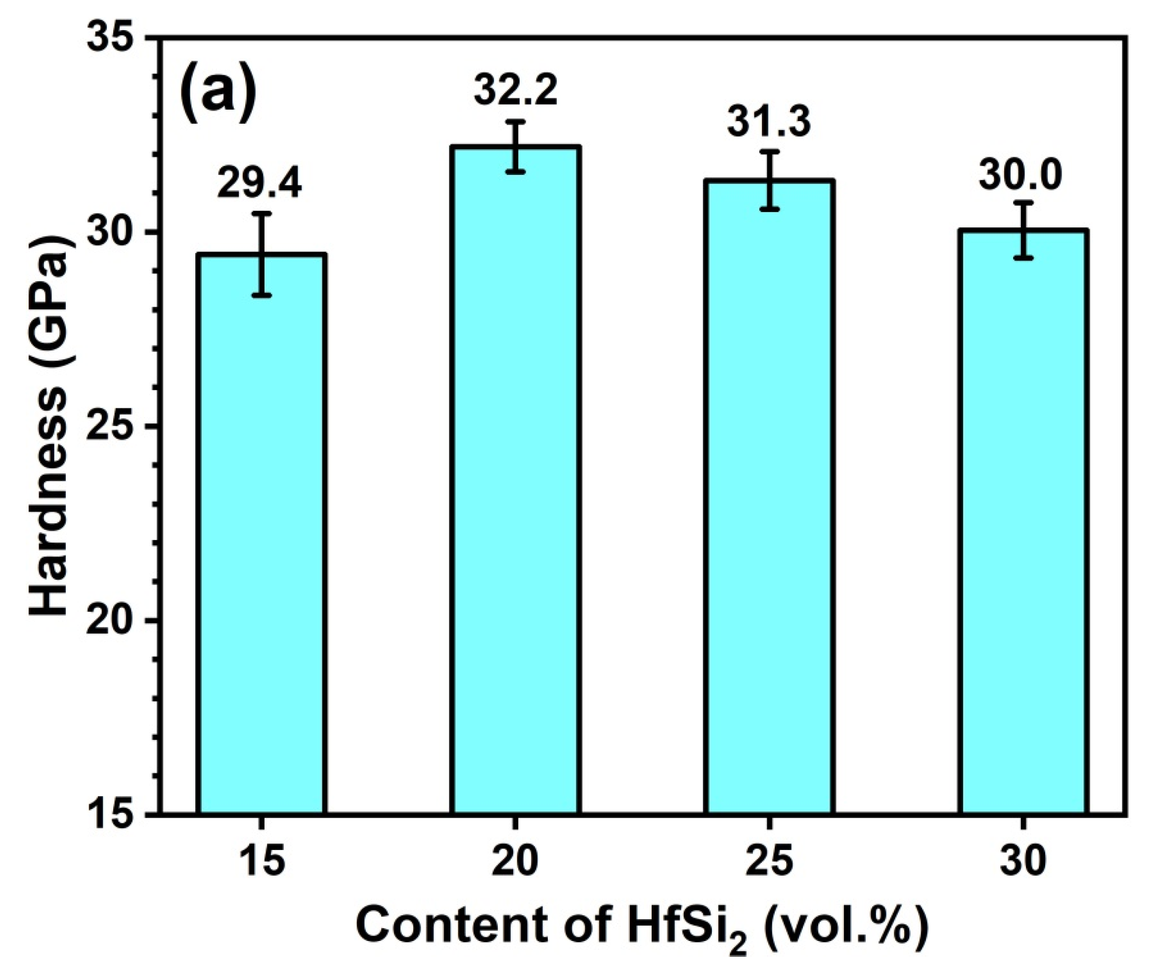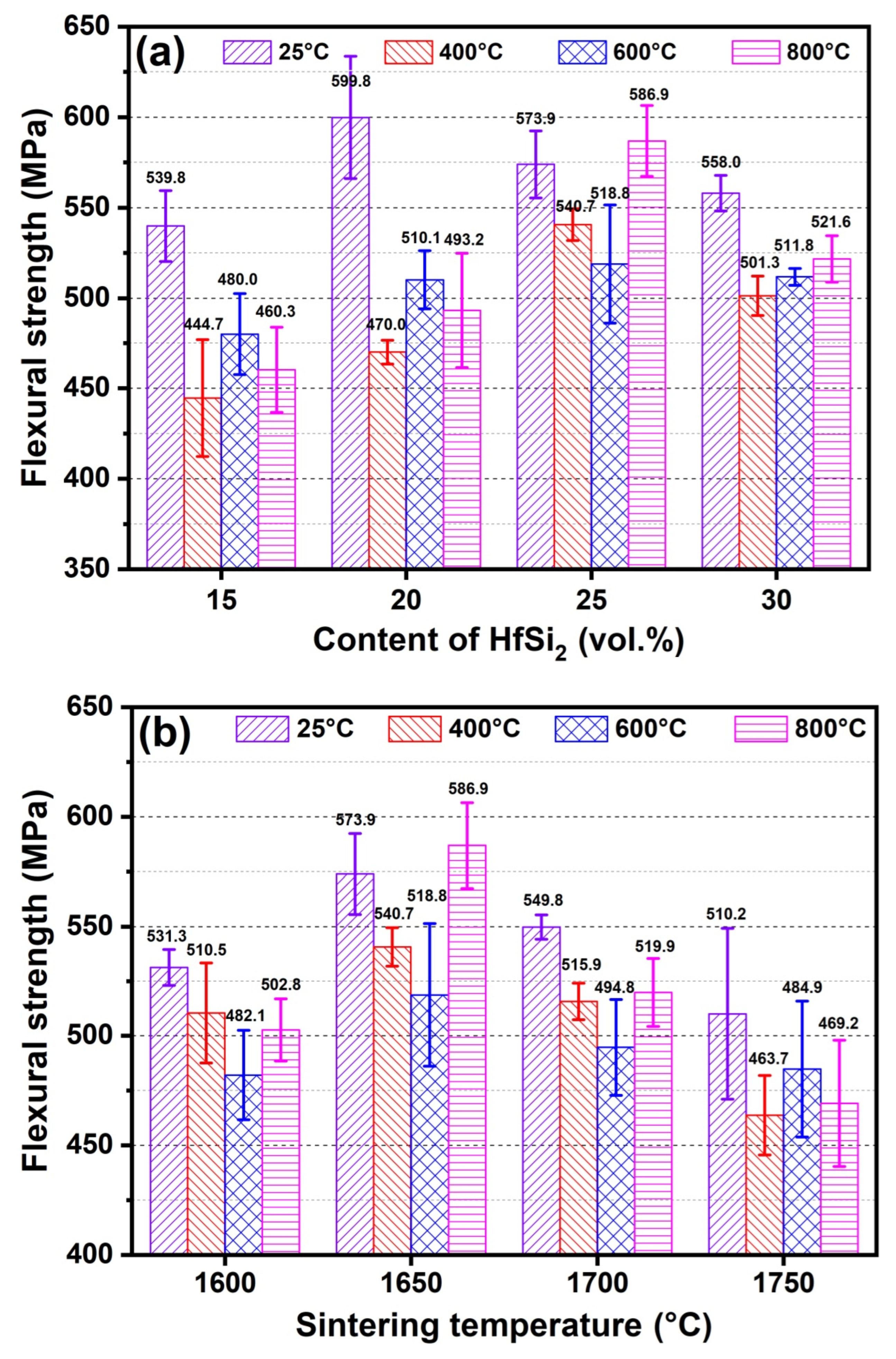 - The formation of HfB2 and SiC improved the density and mechanical properties of B4C-HfB2-SiC composite ceramics. The relative density, Vickers hardness, fracture toughness, and flexural strength of ceramics sintered at 1650 °C with different content of HfSi2 increased first and then decreased with increasing the content of HfSi2. These properties for the ceramics containing 25 vol.% HfSi2 sintered at 1600–1750 °C also showed a similar trend.