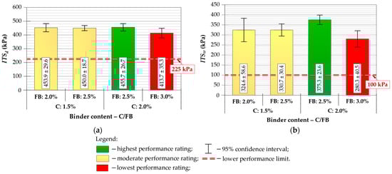 - Indirect tensile strength (ITS) specifications in dry (ITSd) and wet (ITSw) conditions acc. EN 12697-23 [48] standard are as follows: