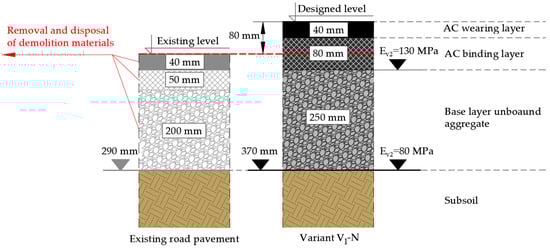 The pavement structure of the existing road section was constructed on a subsoil made of permeable soils (medium sands) with the California bearing ratio (CBR) = 20%, determined in accordance with the EN 13286-47 standard [32]. Water conditions have been defined as good, in which the highest level of free groundwater table occurs at a depth > 2 m below the underside of the pavement structure. At this depth, moisture does not affect subsoil performance, and therefore, no additional drainage or subgrade improvement measures are required.