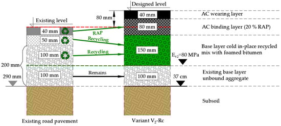 - Recycling-based reconstruction, utilizing CIR-FB and relying on the reclaiming and reuse of materials obtained from the existing asphalt layers (RAP) and the existing unbound base layer (RA).