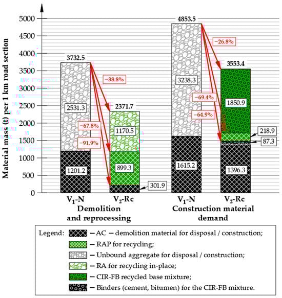 The central hypothesis is that properly characterized and structurally integrated reclaimed materials can increase pavement fatigue life while simultaneously reducing material extraction, emissions and cost. The analysis therefore focuses on parameters most relevant for road authorities: predicted fatigue life, virgin resource demand, demolition volume, transport intensity and overall carbon footprint. A complementary SWOT assessment [28,29] extends these quantitative findings by highlighting implementation conditions, risks and decision constraints relevant to practice.