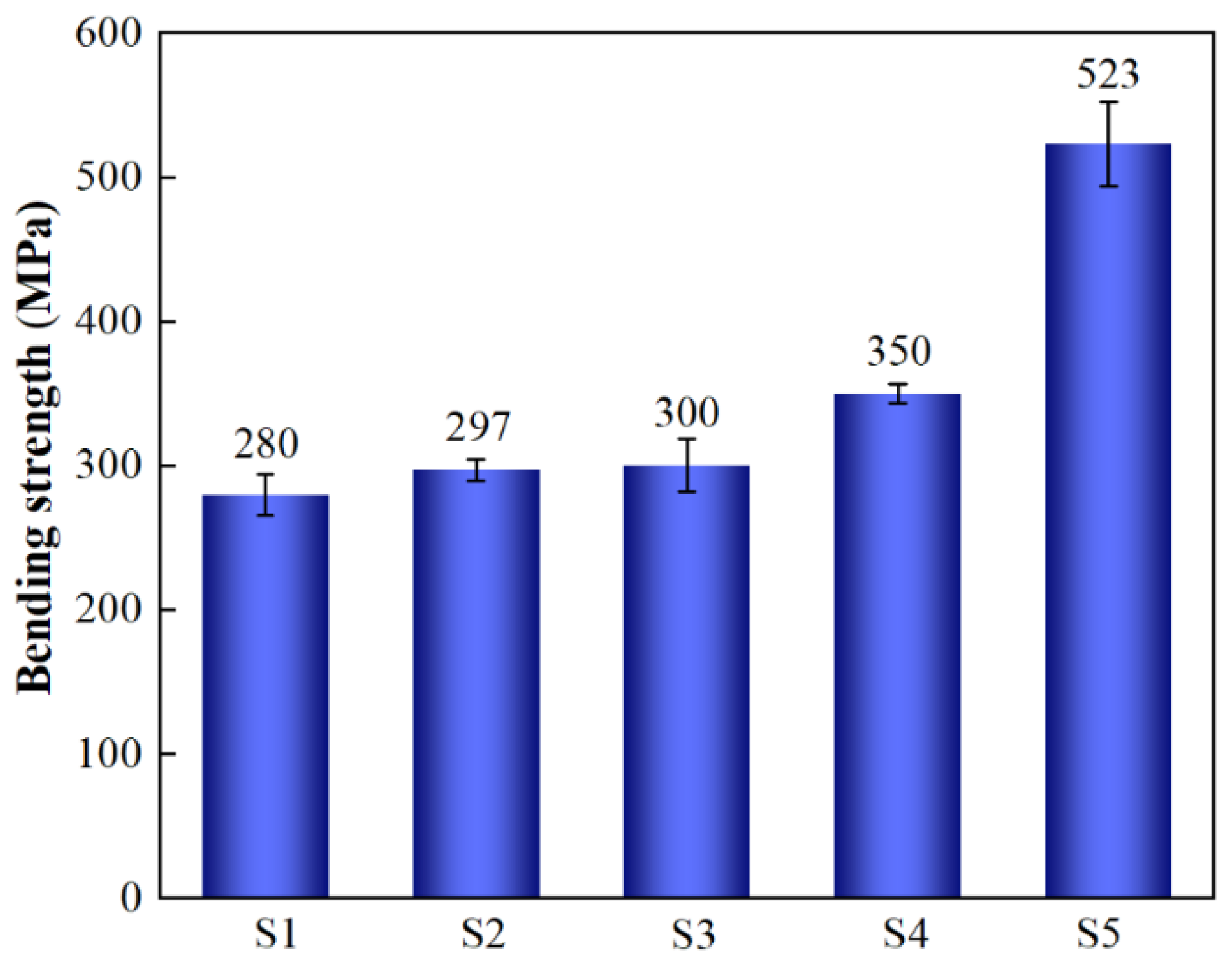 - The bending strength of the composites increases with increasing SiC particle size, which can be attributed to the combined effects of RD and residual thermal stress. Notably, the particle-graded sample (S5=) exhibits the highest flexural strength because particle grading in SiCp/Al composites enables efficient load transfer under tight stacking conditions, with smaller SiC particles taking on higher loads. Additionally, larger SiC particles mitigate residual stress from thermal mismatch and enhance particle uniformity within the material matrix.