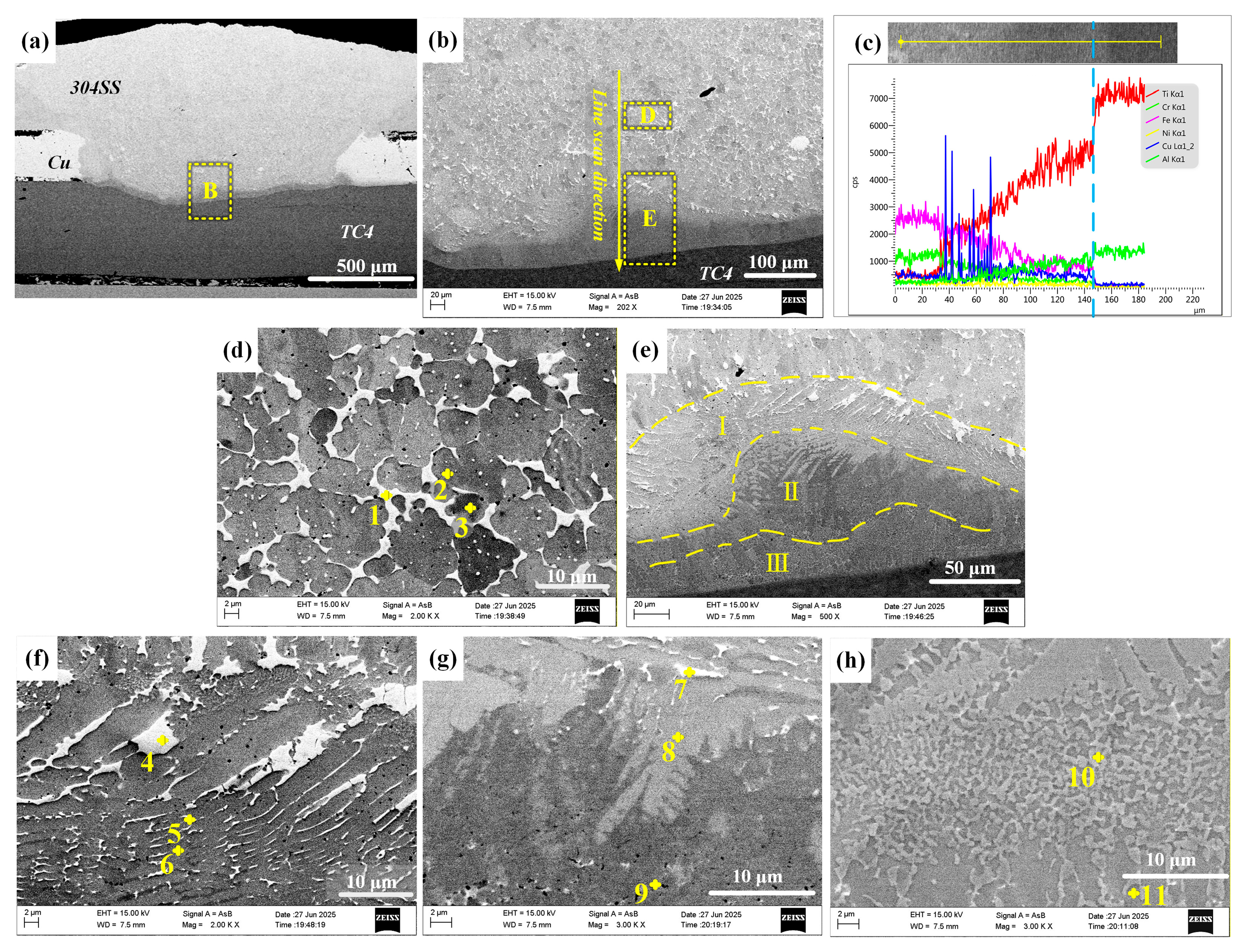 SEM images of Cu-interlayer-assisted TC4/304SS laser-welded joints. (a) Cross-section of the joint; (b) enlarged view of area B in region (a) and schematic of the line scan path; (c) line scanning analysis data corresponding to path in (b); (d) magnified image of area D in (b); (e) magnified image of area E in (b); (f) magnified image of area I in (e); (g) magnified image of area II in (e); (h) magnified image of area III in (e).