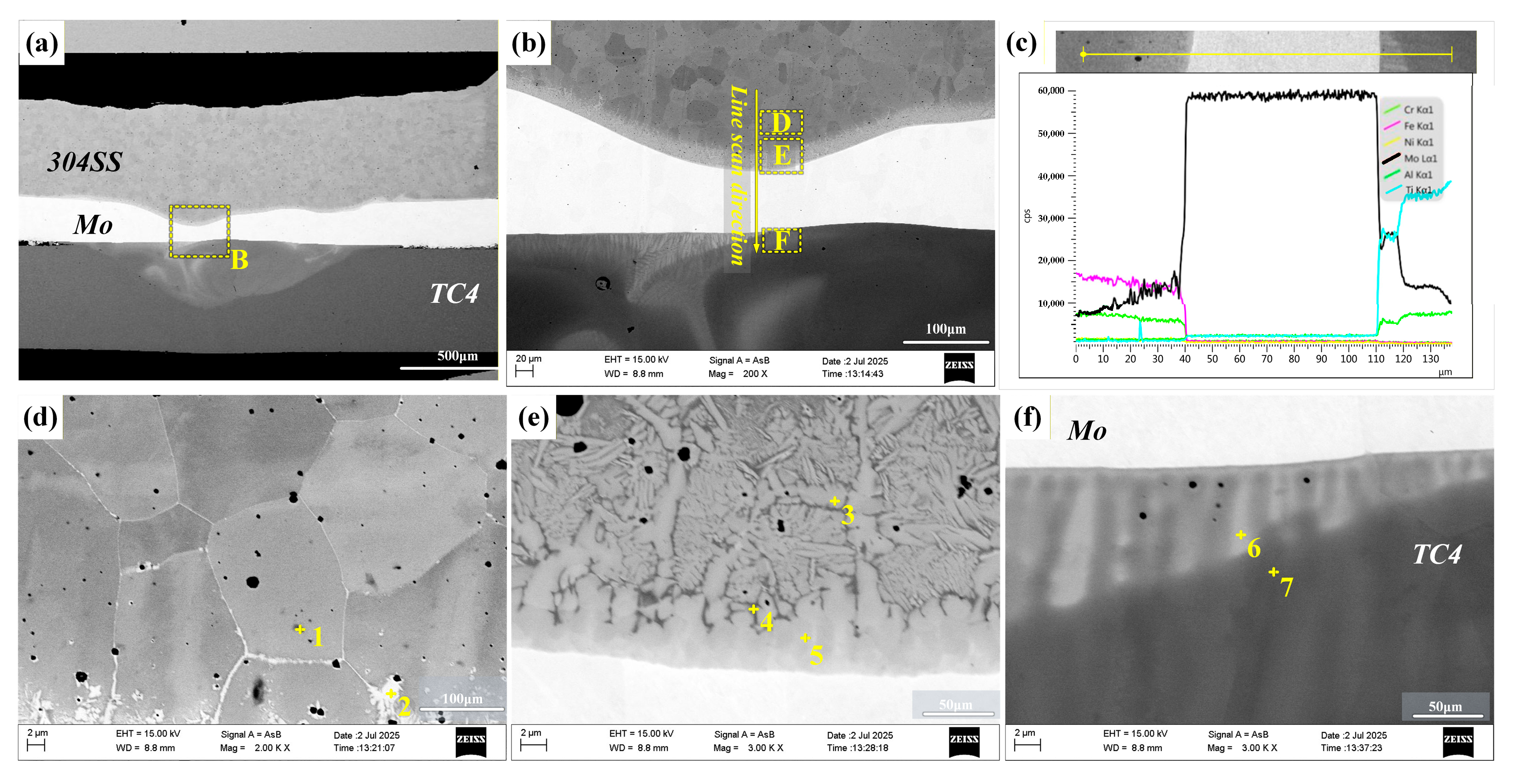 SEM images of Mo-interlayer-assisted TC4/304SS laser-welded joints. (a) Cross-section of the joint; (b) enlarged view of area B in region (a) and schematic of the line scan path; (c) line scanning analysis data corresponding to (b); (d) enlarged image of area D in (b); (e) enlarged image of area E in (b); (f) enlarged image of area F in (b).