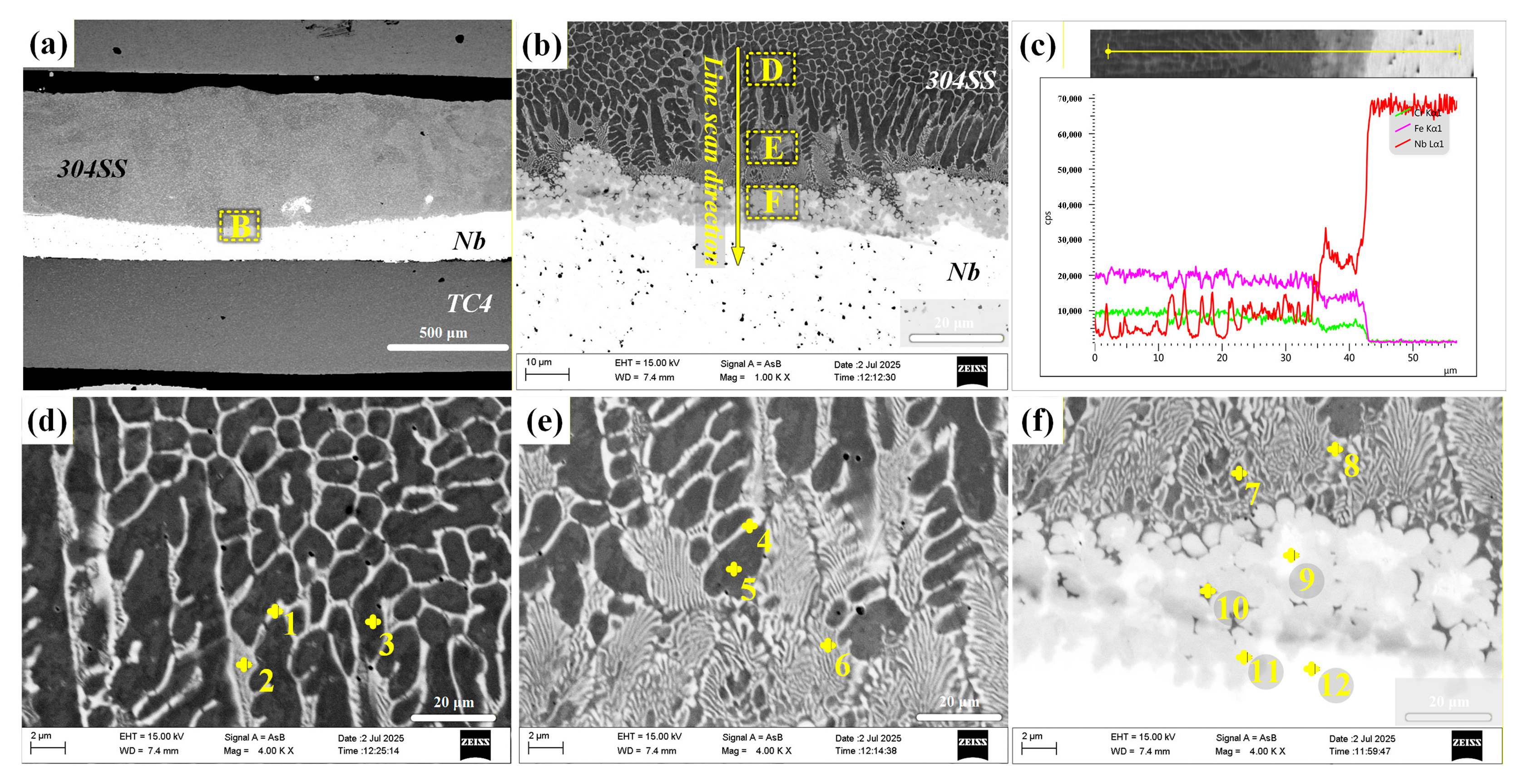 SEM images of Nb-interlayer-assisted TC4/304SS laser-welded joints. (a) Overall cross-sectional image of the weld; (b) enlarged view of area B in region (a) and schematic of the line scan path; (c) line scan analysis data corresponding to (b); (d) enlarged image of area D in (b); (e) enlarged image of area E in (b); (f) enlarged image of area F in (b).