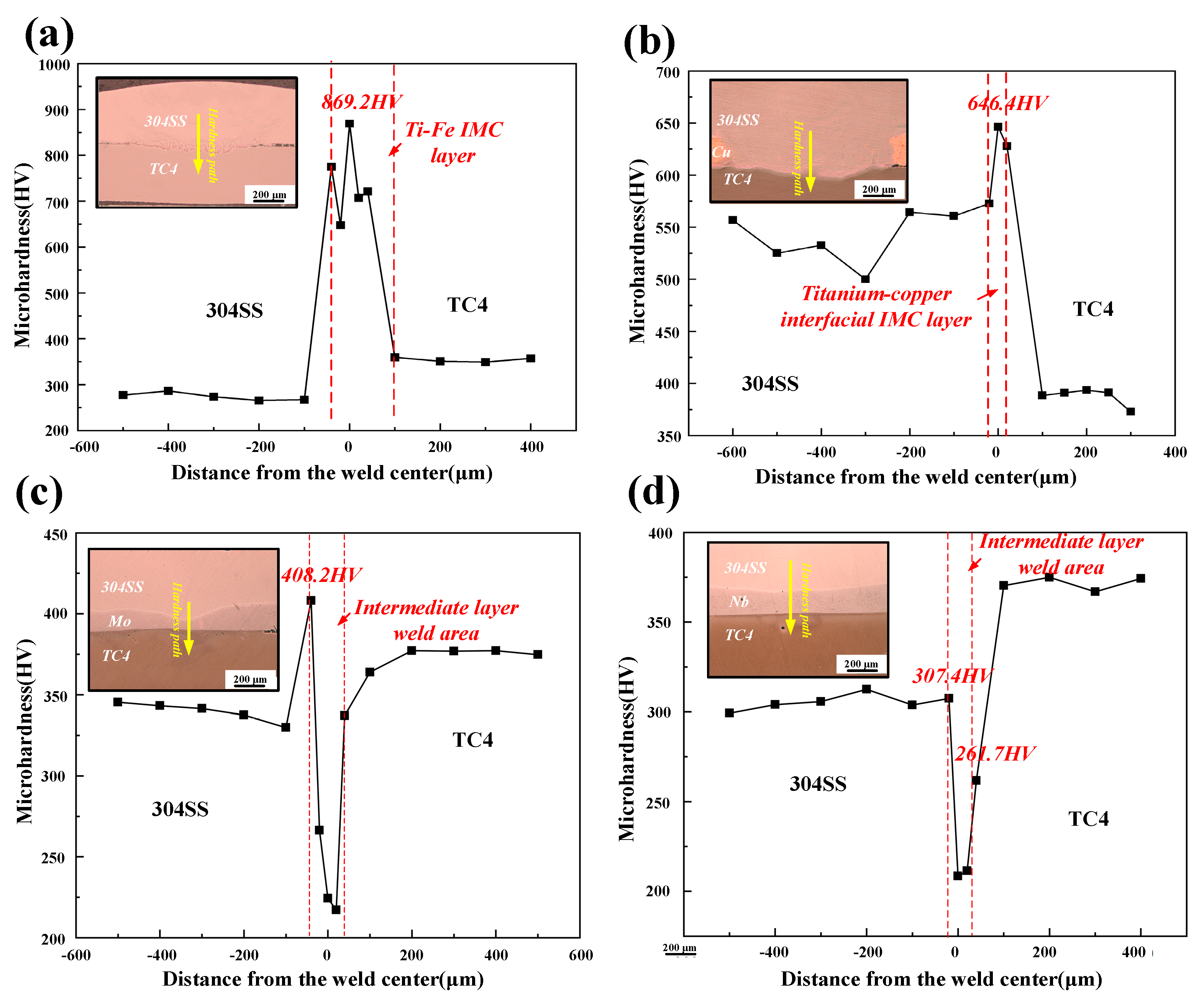 Microhardness images of weld joints with different intermediate layers. (a) Microhardness curve of directly joined joints; (b) microhardness curve of joints with Cu as the intermediate layer; (c) microhardness curve of joints with Mo as the intermediate layer; (d) microhardness curve of joints with Nb as the intermediate layer.