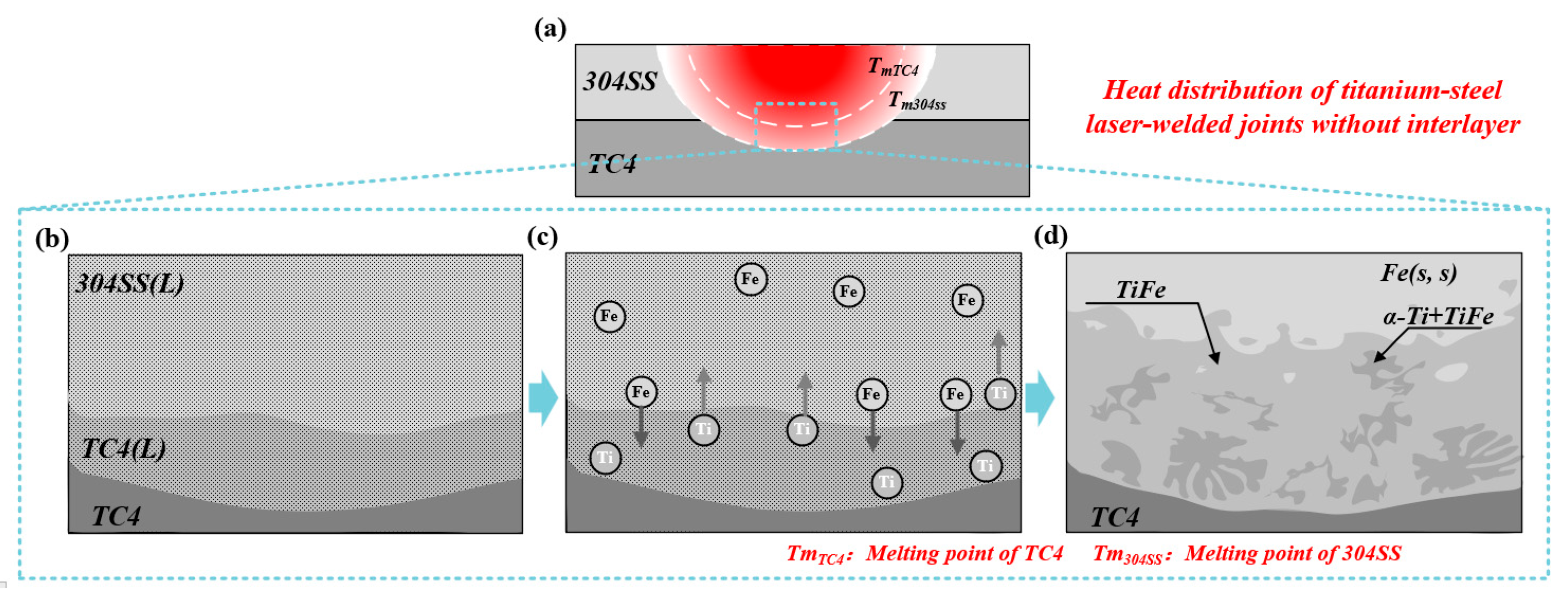 Formation Process of the Direct Titanium-Steel Joint. (a) Schematic Diagram of Hypothetical Overall Thermal Distribution Inside the Welded Joint; (b) melting and intermixing of Ti and Fe atoms; (c) formation sequence of Ti-Fe intermetallic compounds (IMCs); (d) phase composition and distribution within the weld zone at room temperature.