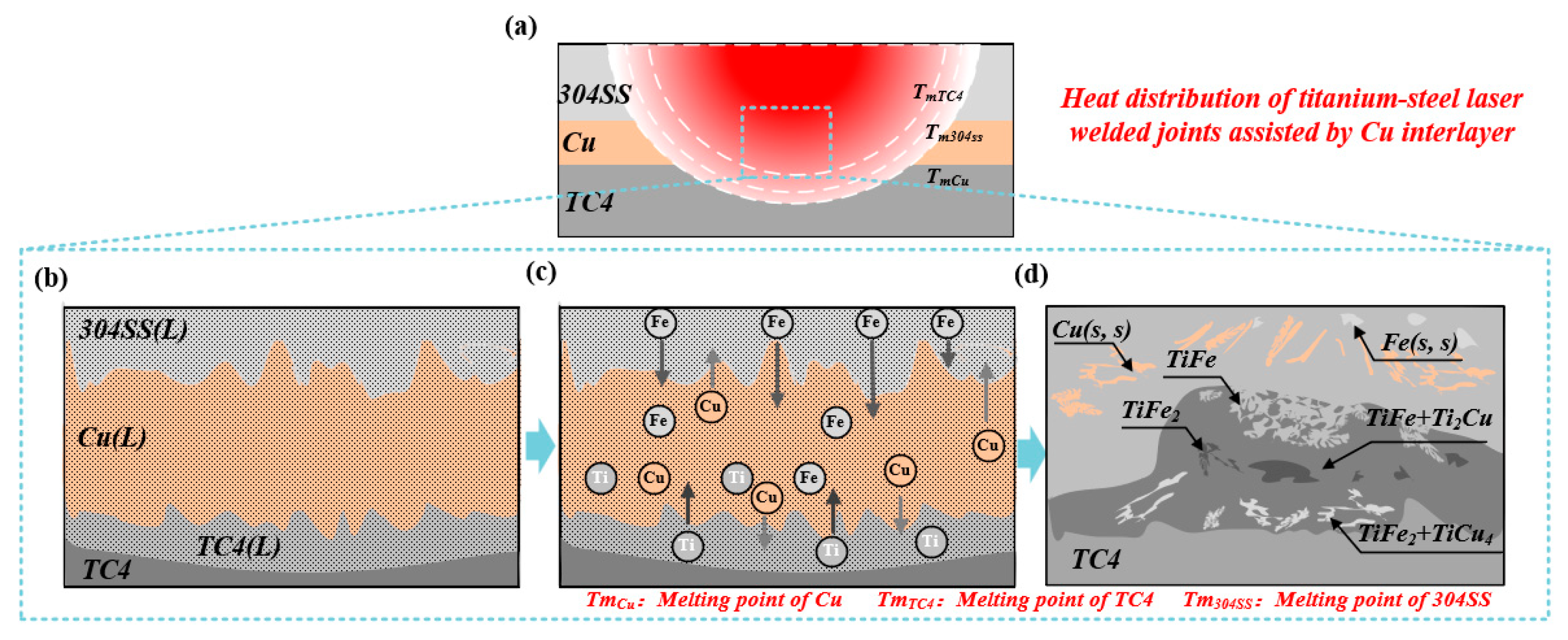 Formation process of titanium-steel dissimilar metal laser welded joints with Cu as the filler metal. (a) Schematic Diagram of Hypothetical Overall Thermal Distribution Inside the Welded Joint; (b) melting and mixing of Cu, Ti, and Fe atoms; (c) formation of Ti-Fe and Ti-Cu intermetallic compound phases; (d) phase composition and distribution in the weld zone of the joint at room temperature.