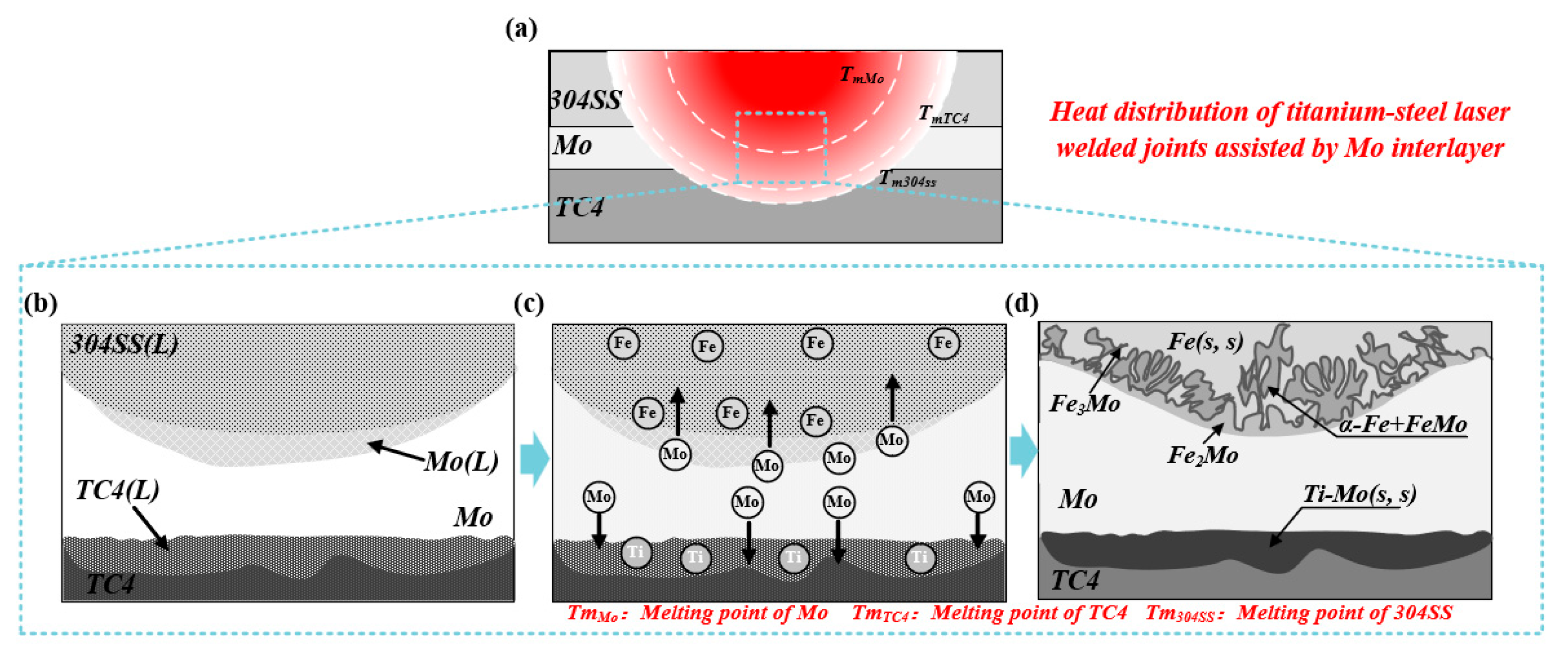 Formation process of titanium-steel dissimilar metal laser welded joints with Mo as the filler metal. (a) Schematic Diagram of Hypothetical Overall Thermal Distribution Inside the Welded Joint; (b) melting and mixing of Mo, Ti, and Fe atoms; (c) formation of Fe-Mo intermetallic compounds and Mo-based solid solution; (d) phase composition and distribution in the weld area of the joint at room temperature.