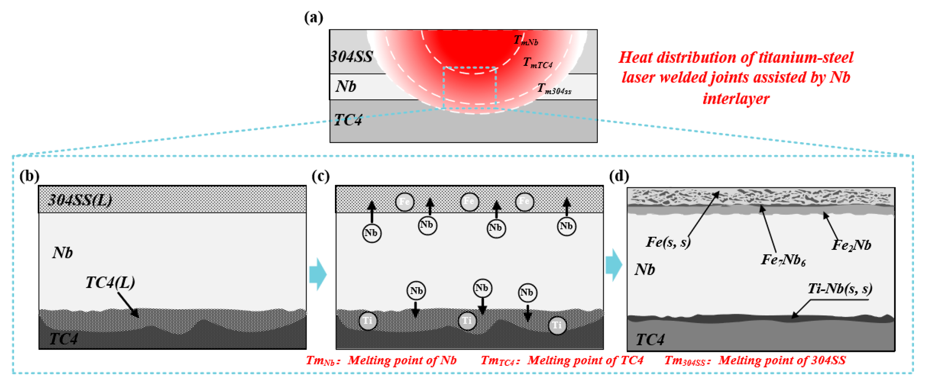 Formation process of titanium-steel dissimilar metal laser welded joints with Nb as the filler metal. (a) Schematic Diagram of Hypothetical Overall Thermal Distribution Inside the Welded Joint; (b) melting and mixing of Cu, Ti, and Fe atoms; (c) formation of Fe-Nb intermetallic compounds and Nb-based solid solution; (d) phase composition and distribution in the weld zone of the joint at room temperature.