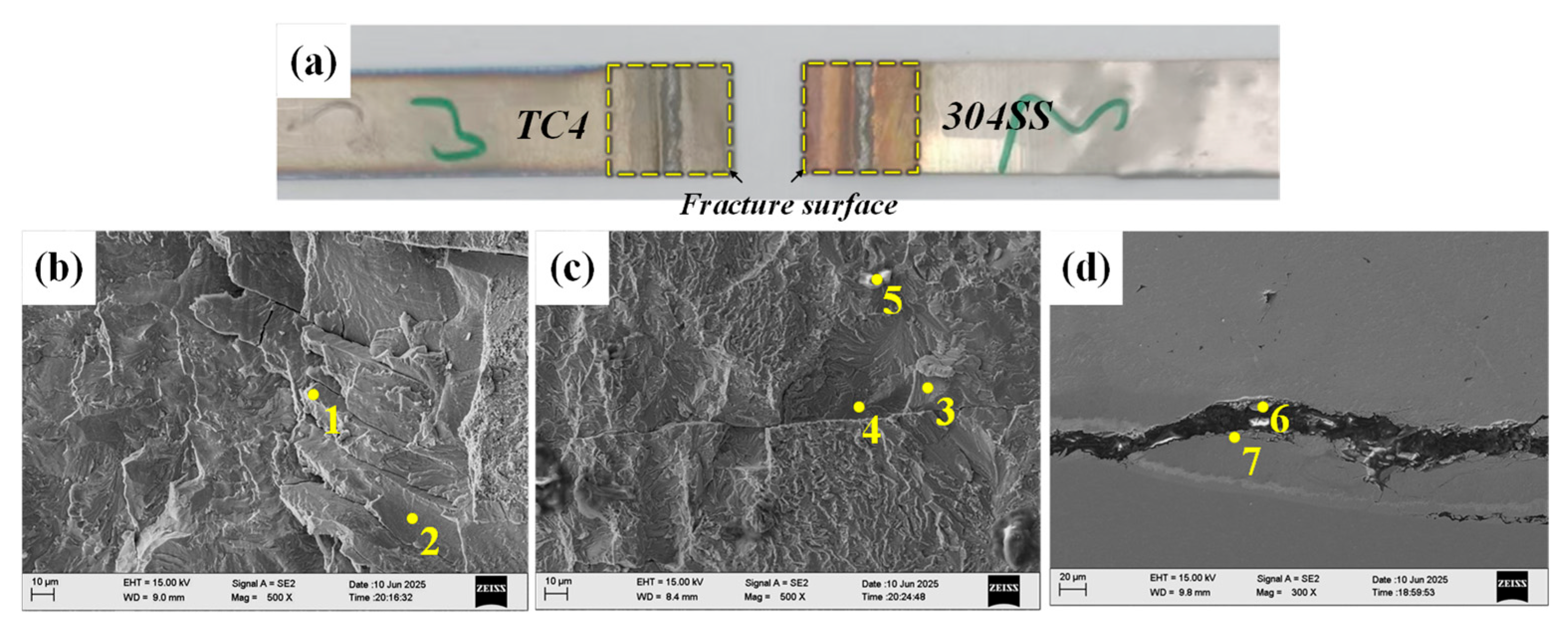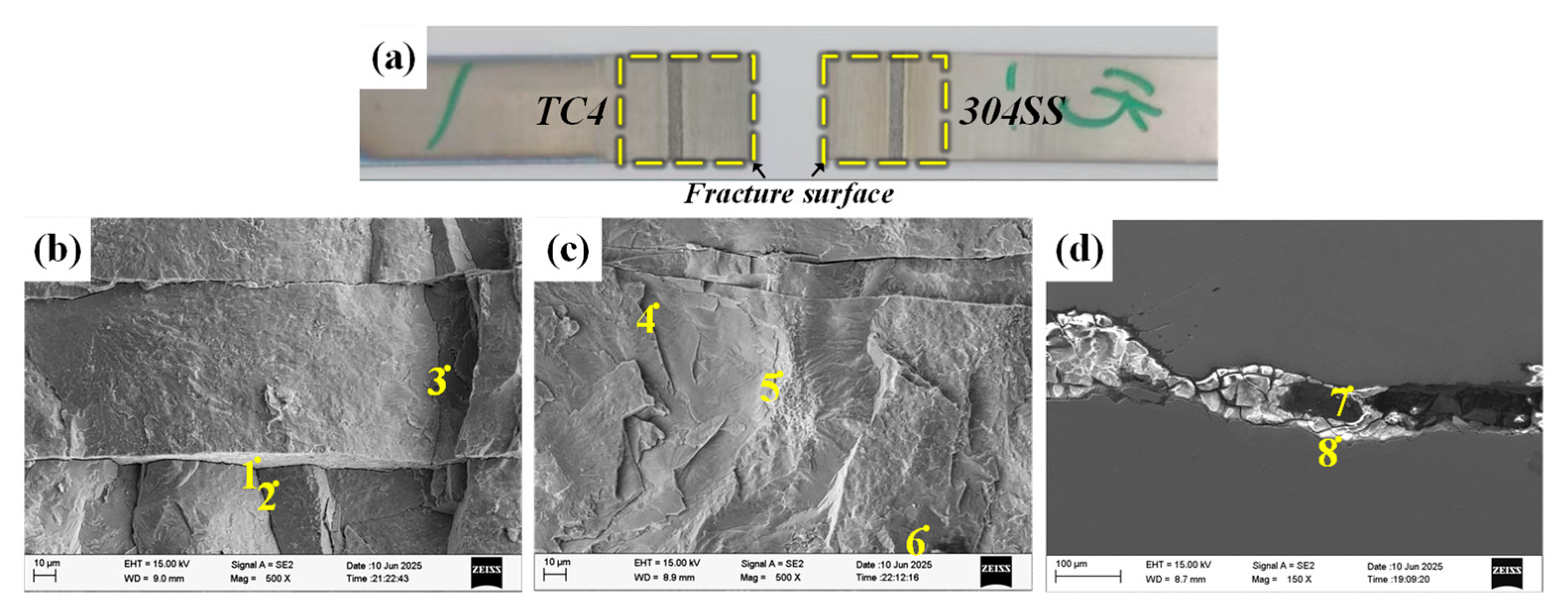 Images of the tensile fracture cross-section of directly connected joints and the fracture path. (a) Macroscopic image of the fracture; (b) fracture image on the TC4 side; (c) fracture image on the 304SS side; (d) fracture path.