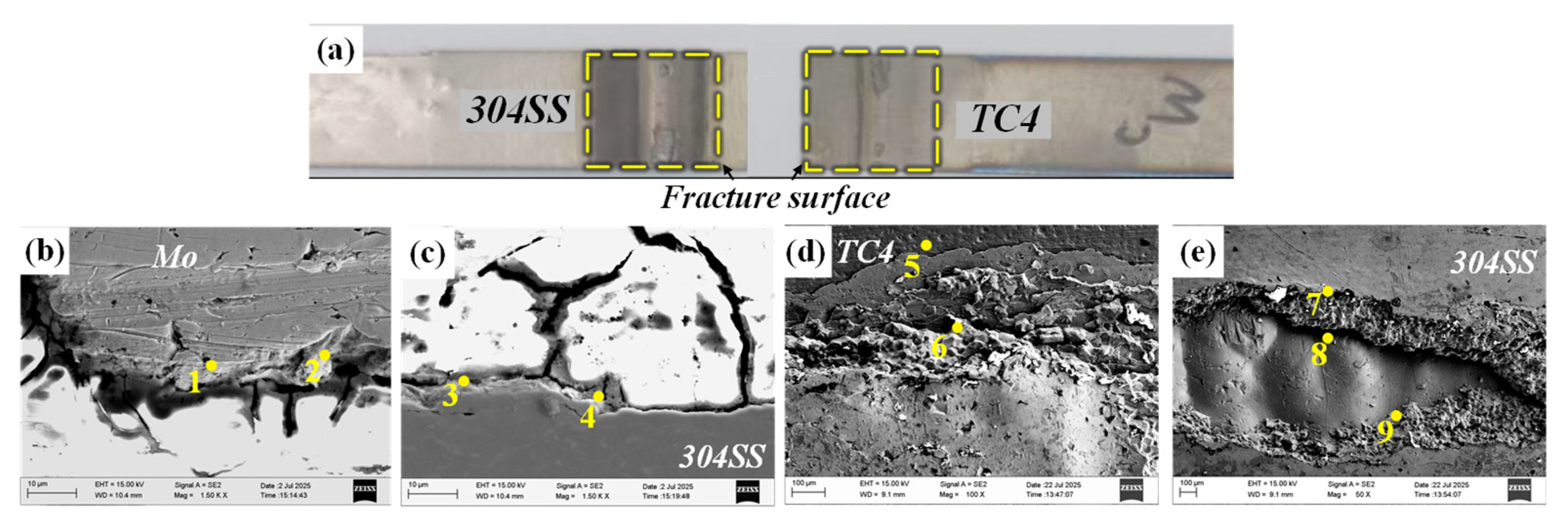 Tensile fracture cross-sectional images and fracture path of the joint with Mo intermediate layer. (a) Macroscopic image of the fracture sample; (b) fracture path; (c) fracture path; (d) fracture surface on the Ti side; (e) fracture surface on the Fe side;.