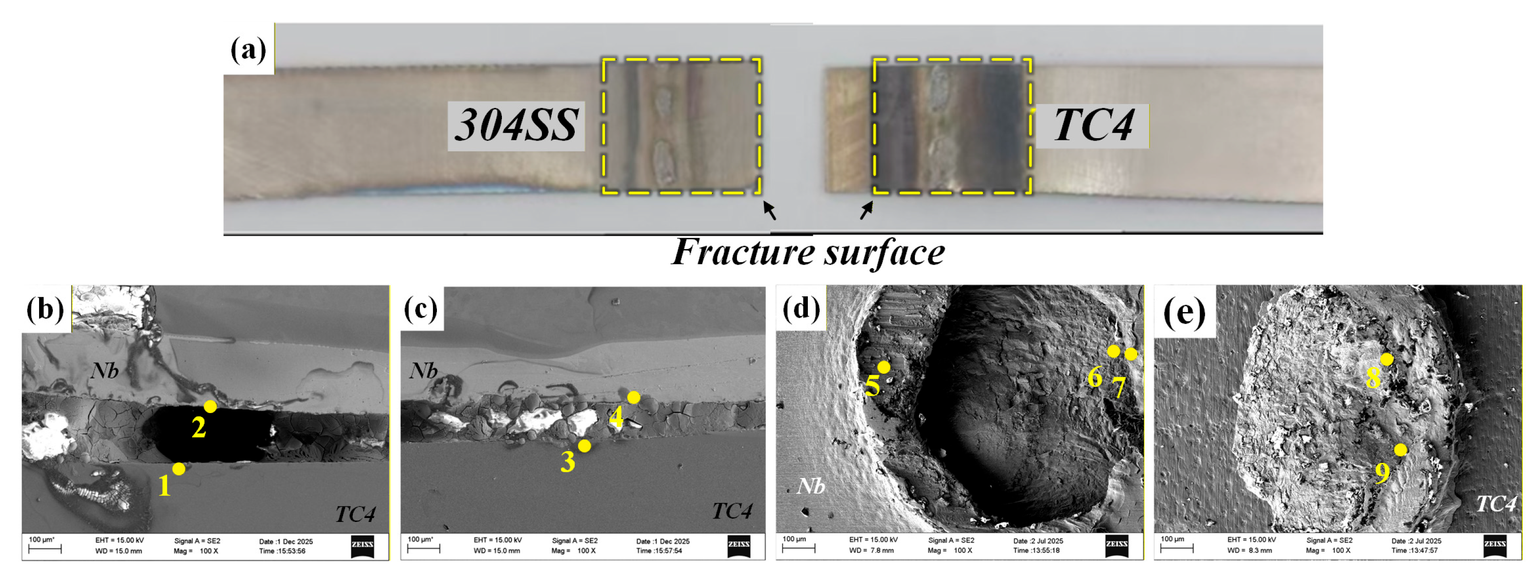 Tensile fracture cross-sectional images and fracture paths of Nb intermediate layer joints. (a) Macroscopic fracture image; (b) fracture path; (c) fracture path; (d) fracture surface on the 304SS/Nb side; (e) fracture surface on the TC4/Nb side.