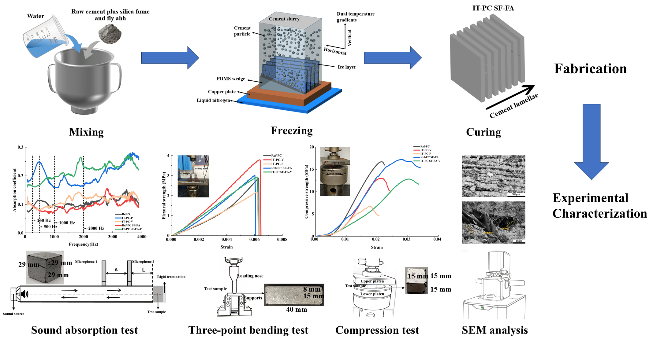 - The cement materials incorporating fly ash and silica fume fabricated via the ice-templating method exhibit a significant improvement in sound absorption performance. Acoustic impedance tube tests demonstrated that the NRC of the novel cement-based material increased by 82%. This enhancement is attributed to the synergistic effect of the ice-templating method and the hybrid blend: the aligned macro-pores created by ice-templating method provide efficient channels for sound wave propagation and dissipation. Simultaneously, the hybrid blend, by increasing paste viscosity and through pozzolanic reactions, synergistically refines the macro-channels and introduces micro/nano-scale secondary porosity. Together, they form an ideal hierarchical sound-absorbing structure characterized by “macroscopically interconnected and microscopically dense” pores. This demonstrates that a strategy combining “macro-structural design” with “micro-component optimization” can overcome the traditional trade-off between mechanical and functional properties in materials, establishing a new paradigm for developing high-performance building acoustic materials.