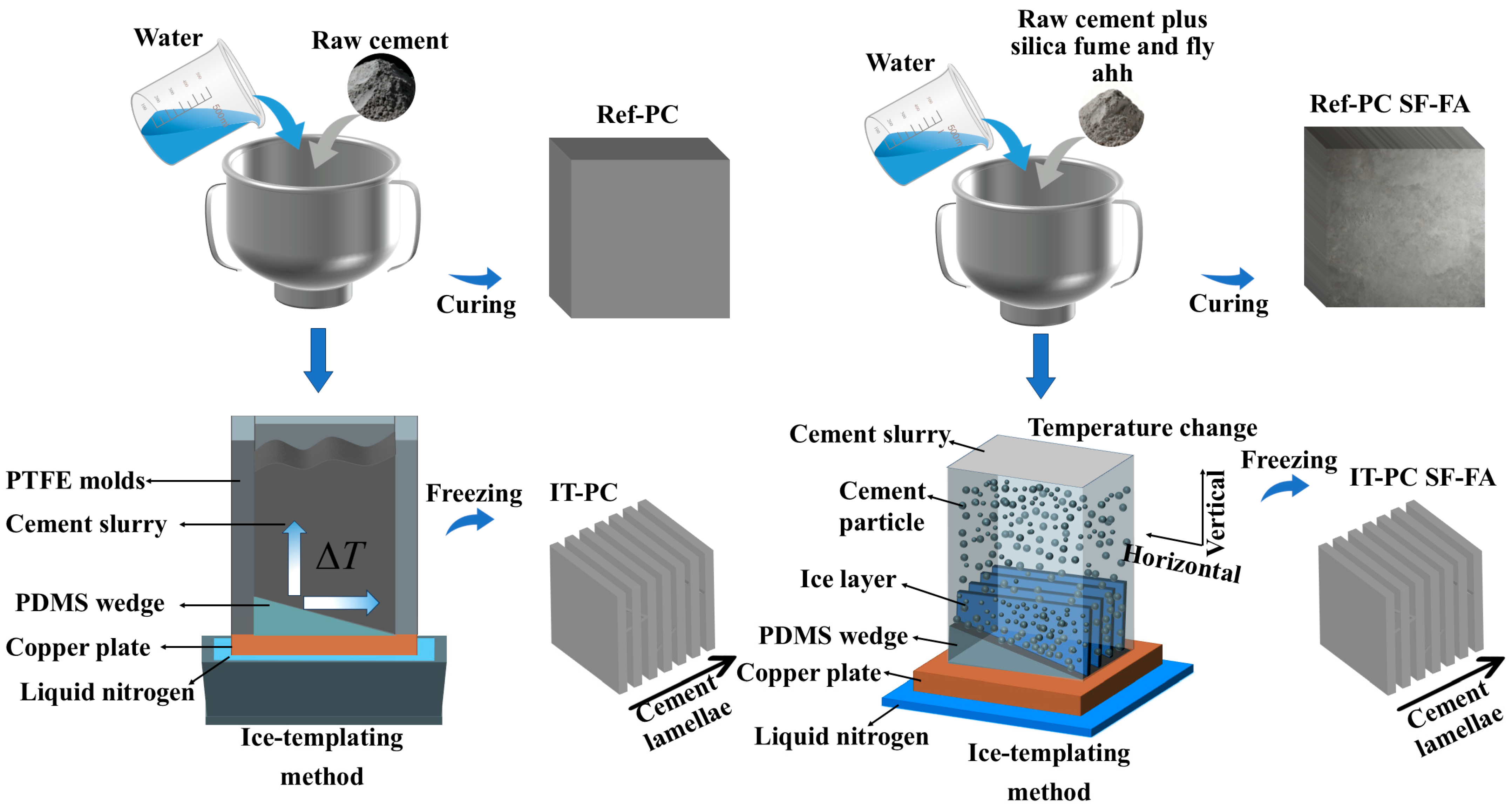 2.2. Preparation of Ice-Templated Cement-Based Composites with Silica Fume/Fly Ash