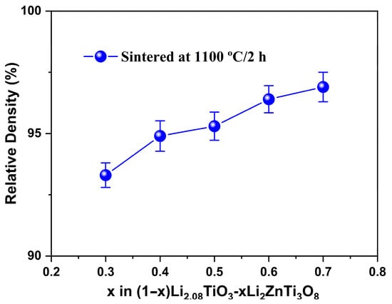 Relative sintered density of (1 − x)Li2.08TiO3–xLi2ZnTi3O8 (x = 0.3–0.7) ceramics sintered at 1100 °C for 2 h.