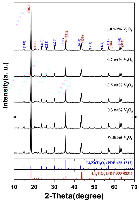 As a prerequisite for reliable evaluation of material properties, we first verified phase stability under LTCC-relevant firing conditions. Figure 5 shows XRD patterns of 0.6LT–0.4LZT doped with 0.3–1 wt.% V2O5 and sintered at 900 °C for 30 min. Within the XRD detection limit, only reflections from LT and LZT are observed; no reaction products are detected. This confirmation ensures that the subsequent microwave–dielectric properties are not confounded by secondary phases formed during sintering.
