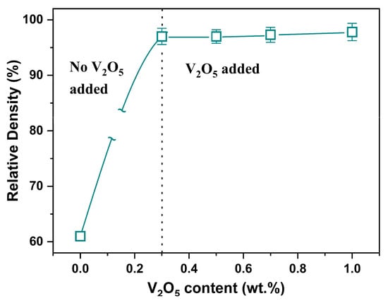 With the sintering schedule fixed at 900 °C for 30 min, we next assessed how V2O5 content affects densification under this window. Figure 8 summarizes the relative density of 0.6LT–0.4LZT specimens sintered at 900 °C for 30 min as a function of V2O5 content (0–1.0 wt.%).