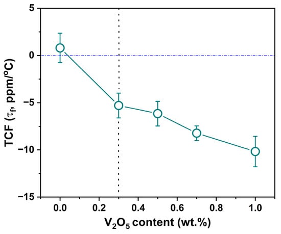 Effect of V2O5 addition on the temperature coefficient of resonant frequency () for 0.5Li2.08TiO3–0.5Li2ZnTi3O8 ceramics. The at 0 wt.% data point was measured when sintered at 1100 °C for 2 h, while the at the V2O5-doped data points at 900 °C for 30 min. The vertical dashed line at 0.3 wt.% marks the onset of V2O5 addition.