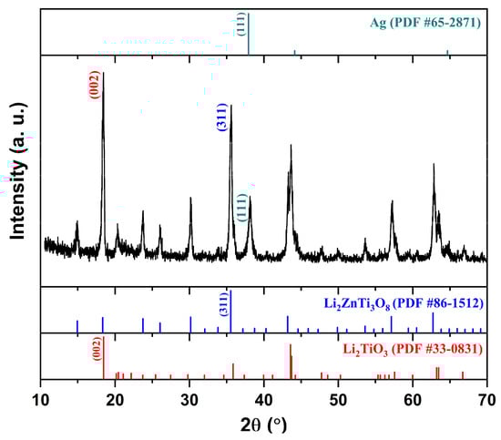 XRD patterns of 0.3 wt.% V2O5-doped 0.6Li2.08TiO3–0.4Li2ZnTi3O8 ceramics mixed with 20 wt.% Ag and co-fired in air at 900 °C for 30 min.