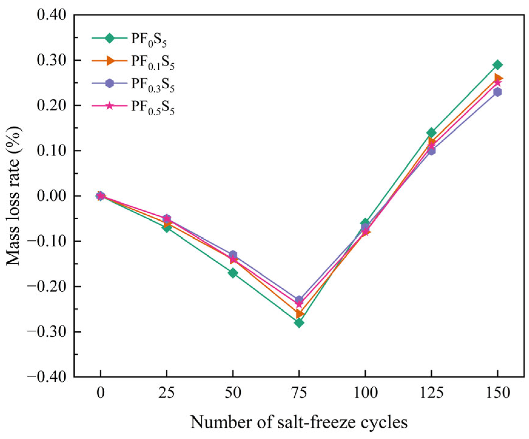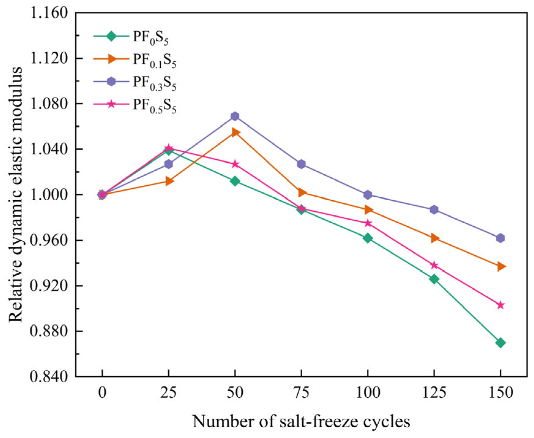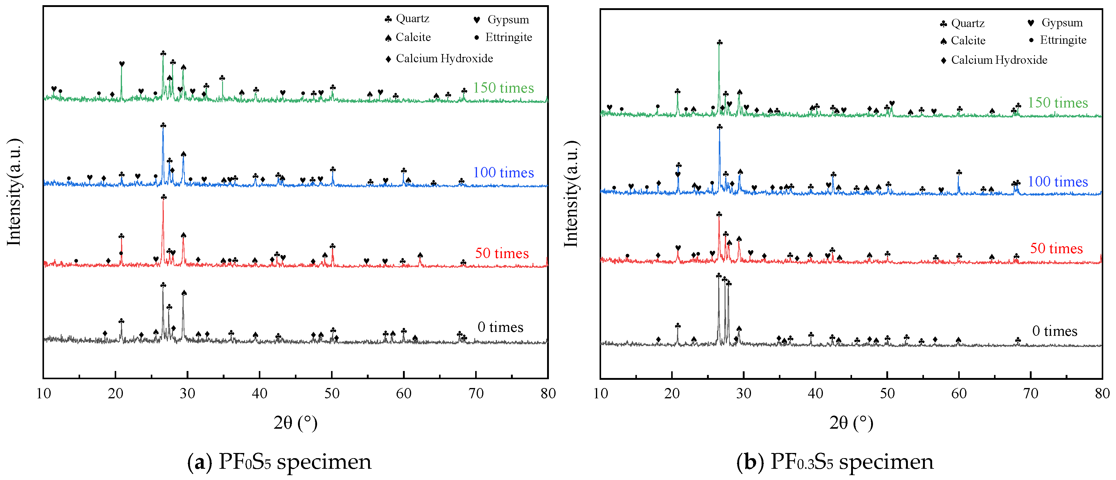 - XRD diffraction analysis indicated that with increasing salt-freeze cycles, the content of erosion products (ettringite and gypsum) in concrete gradually rose, with the gypsum proportion showing significant enhancement alongside increasing sulfate ion concentration, while portlandite content progressively decreased. Comparative analysis revealed that PF0.3S5 specimens generally exhibited lower formation of erosion products than PF0S5 specimens, demonstrating superior salt-freeze resistance. This suppression of deleterious chemical reactions, alongside the physical crack-bridging, constitutes the dual micro-mechanism responsible for the improved long-term durability of fiber-reinforced concrete under coupled attack.