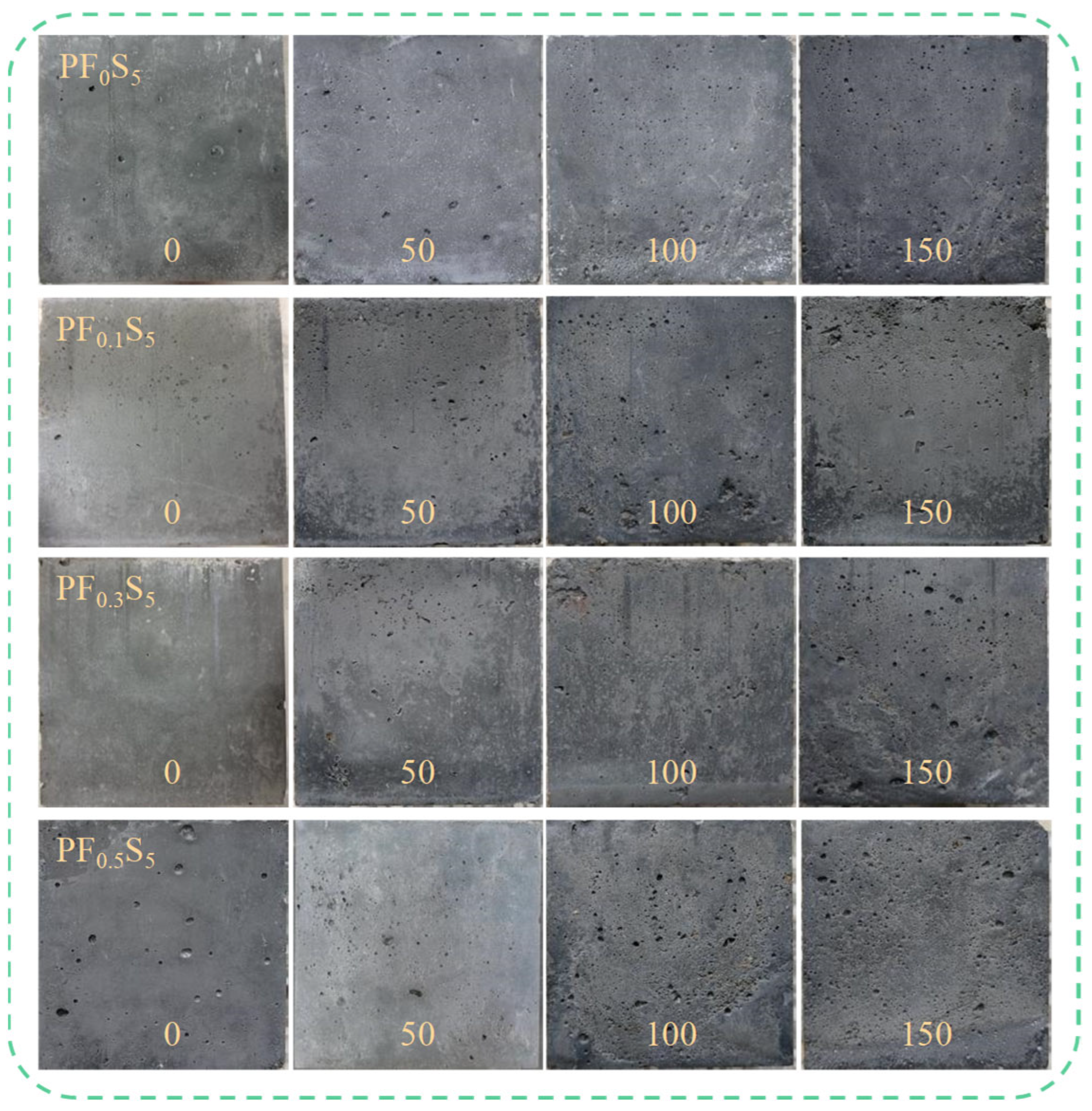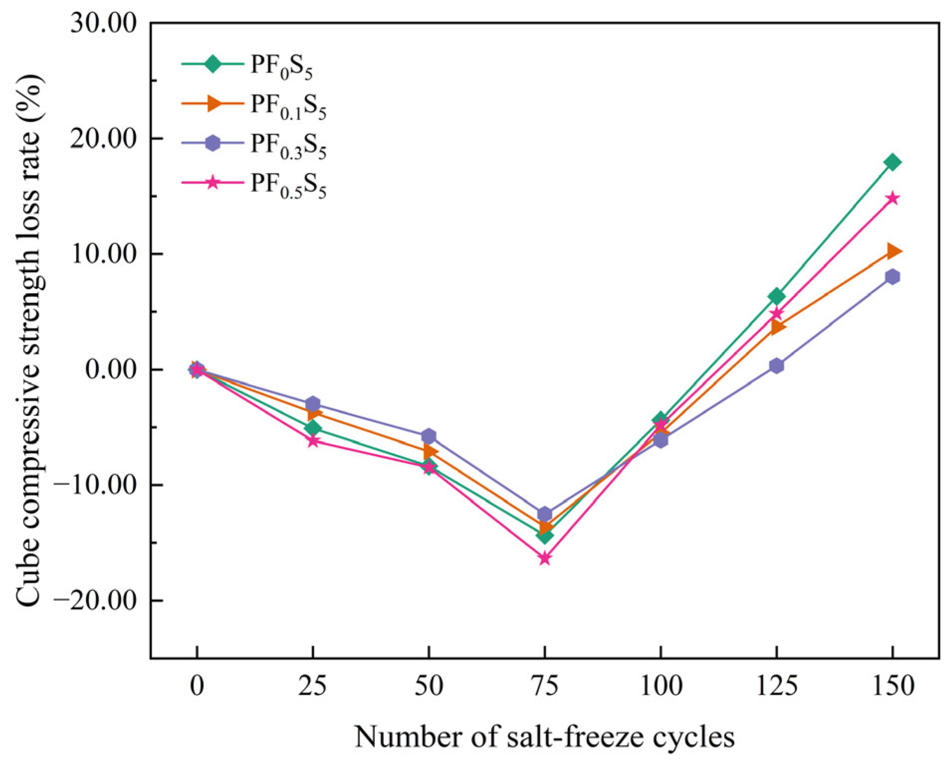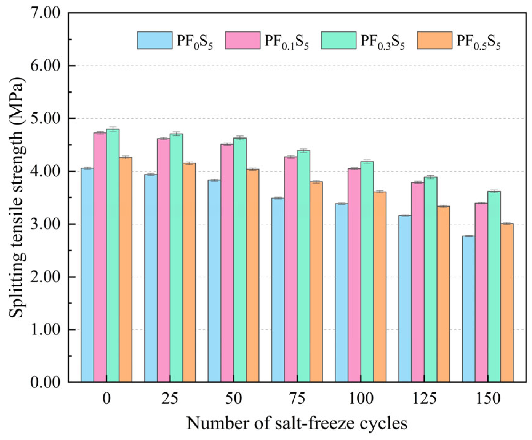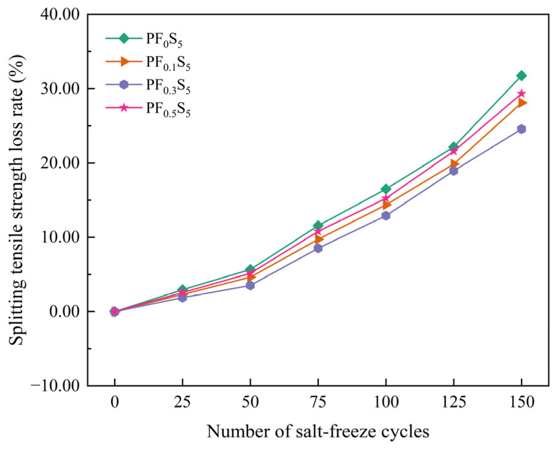 - XRD diffraction analysis indicated that with increasing salt-freeze cycles, the content of erosion products (ettringite and gypsum) in concrete gradually rose, with the gypsum proportion showing significant enhancement alongside increasing sulfate ion concentration, while portlandite content progressively decreased. Comparative analysis revealed that PF0.3S5 specimens generally exhibited lower formation of erosion products than PF0S5 specimens, demonstrating superior salt-freeze resistance. This suppression of deleterious chemical reactions, alongside the physical crack-bridging, constitutes the dual micro-mechanism responsible for the improved long-term durability of fiber-reinforced concrete under coupled attack.