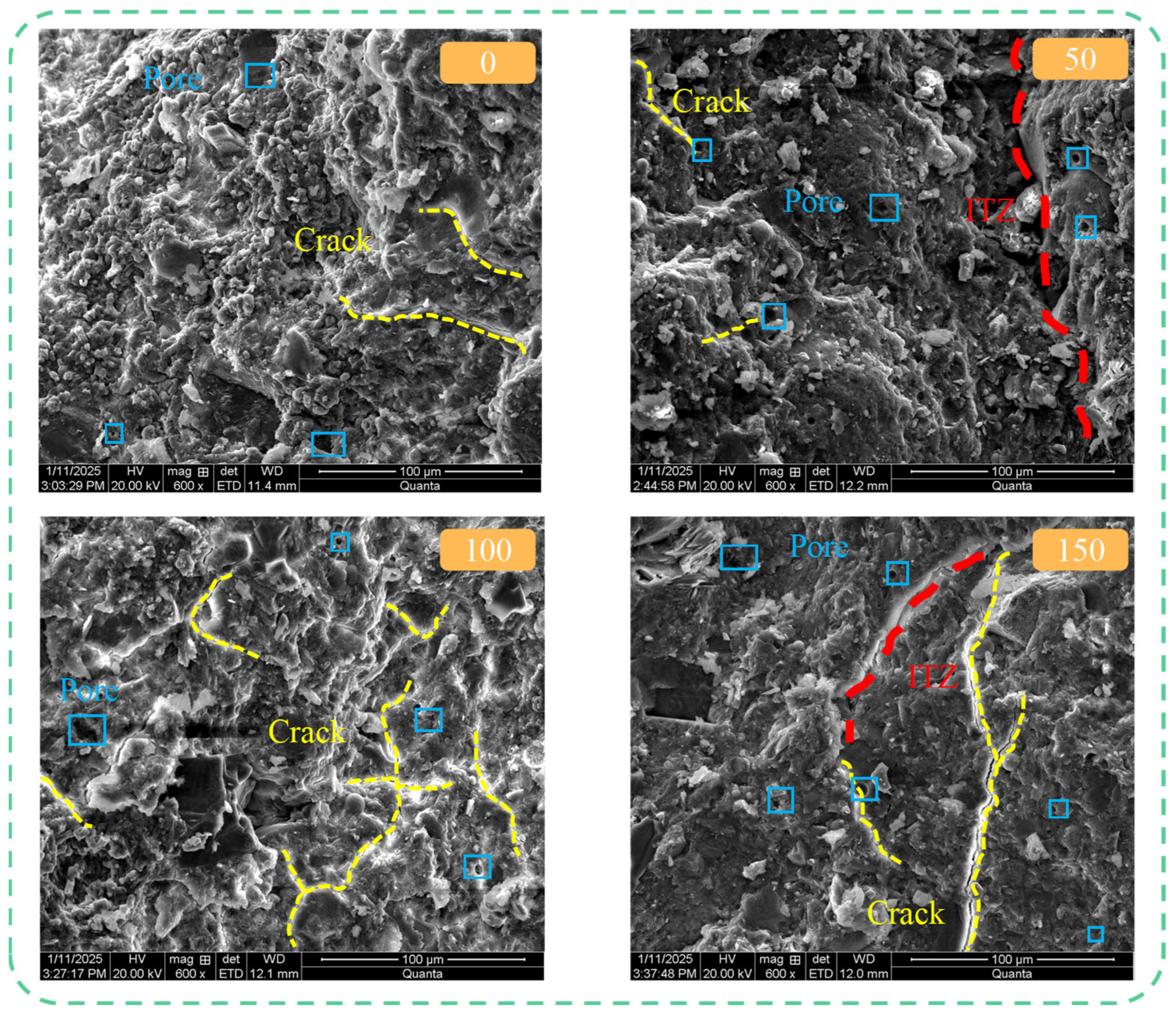 - Comparative SEM micrographs revealed a denser microstructure with fewer visible pores and microcracks in PVA fiber concrete than in plain concrete. This microstructural improvement, consistent with the pore-refining capability reported for PVA fibers [18], is attributed to the strong fiber–matrix bonding and the physical filling effect of fibers. After exposure, the plain concrete developed extensive porosity and interconnected cracks, whereas the fiber-reinforced concrete showed restrained crack propagation without forming continuous damage paths, confirming the effective crack-bridging role of fibers. These mechanisms collectively explain the enhanced crack resistance and toughness observed at the macro scale.
