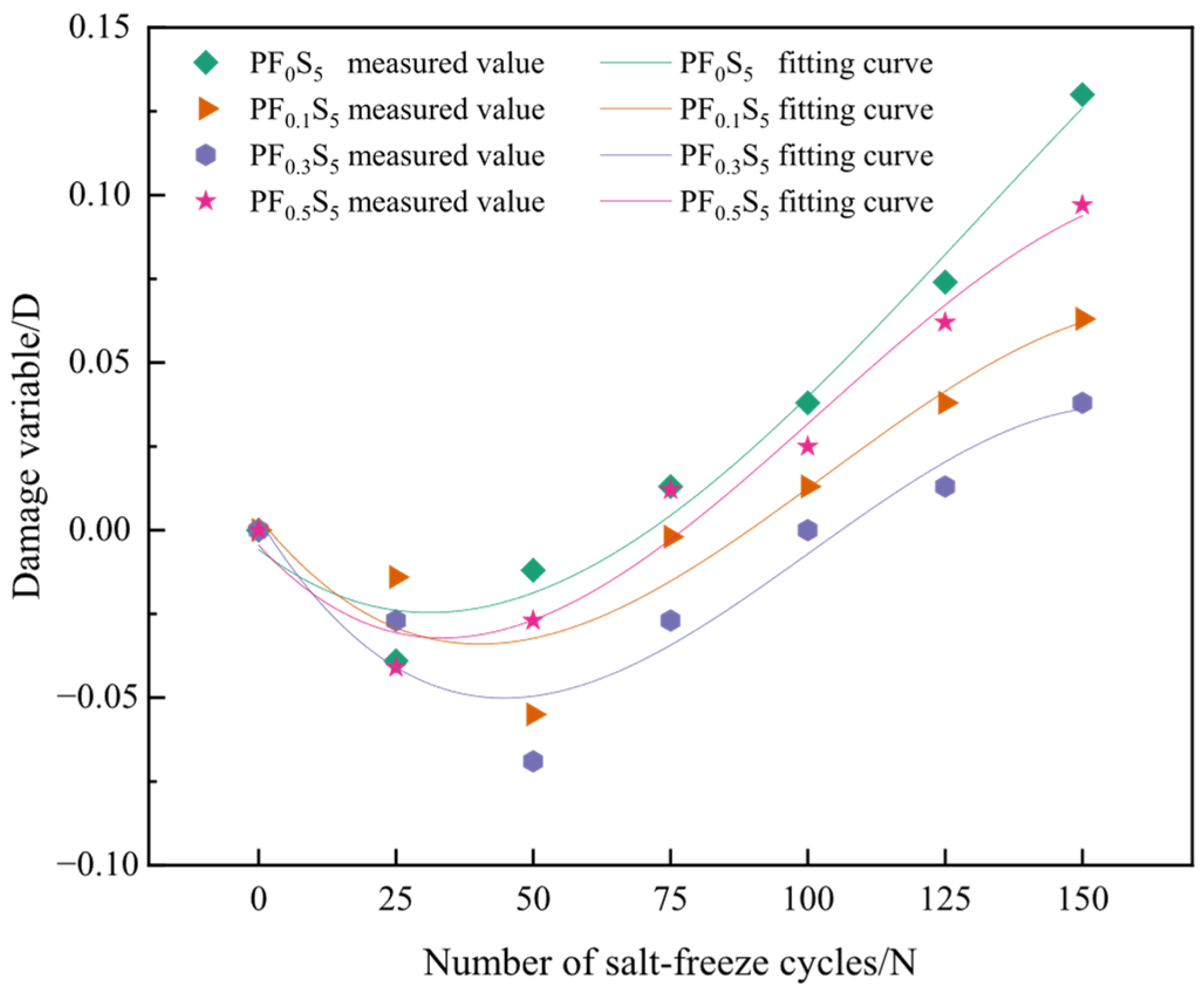 - A damage evolution model, established based on the loss rate of relative dynamic elastic modulus, demonstrated a high-accuracy cubic relationship between damage degree D and salt-freeze cycles N (R2 > 0.88). This empirical model offers a valuable quantitative tool for predicting the damage progression and assessing the residual service life of PVA fiber-reinforced concrete in similar service conditions.