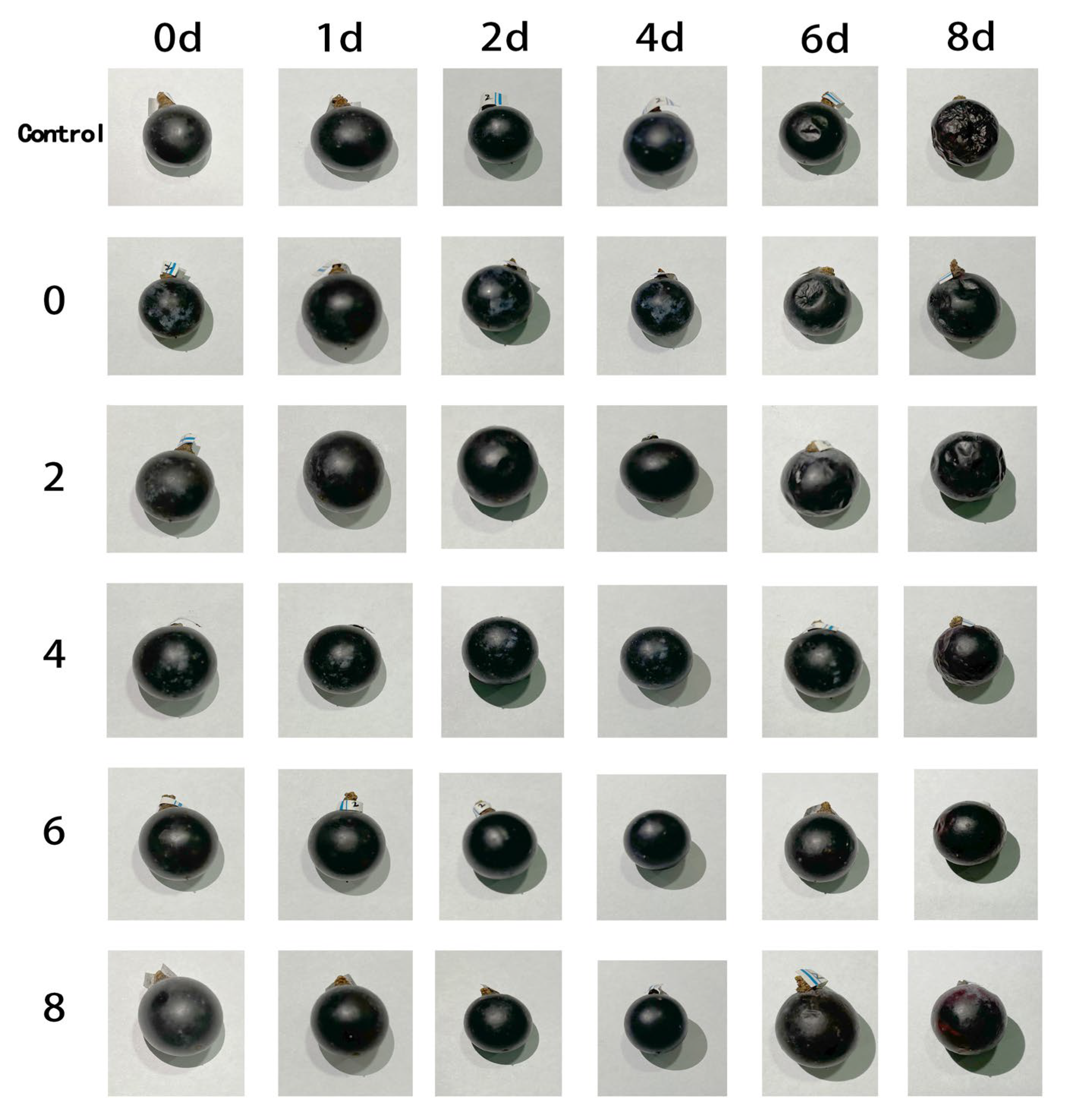 - Yang, M.; Luo, Z.; Li, D.; Ma, C.; Li, L. Role of epicuticular wax involved in quality maintenance of table grapes: Evidence from transcriptomic data. Postharvest Biol. Technol. 2023, 196, 112155. [Google Scholar] [CrossRef]