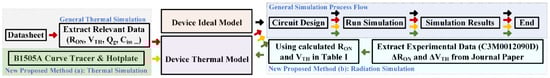 - Thermal Strategy: This involves calibrating the power device using the B1505A curve tracer (Keysight, Santa Rosa, CA, USA), with the device placed on a hot plate for high-temperature testing. The resulting characteristics, typically not provided in the datasheet, are then applied in thermal simulation using a system-level simulation tool.