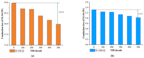 (a) Power conduction losses of SiC MOSFETs (S1–S4) under different TIDs (Rload = 500 ). (b) Power conduction losses of SiC MOSFETs (S1–S4) under different TIDs (Rload = 1000 ).