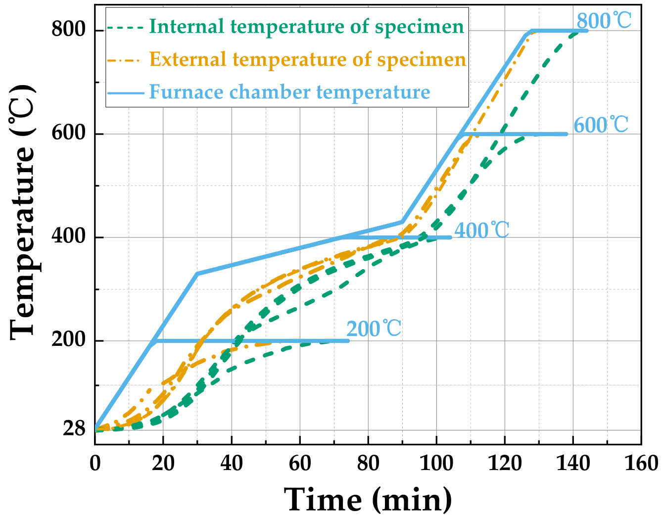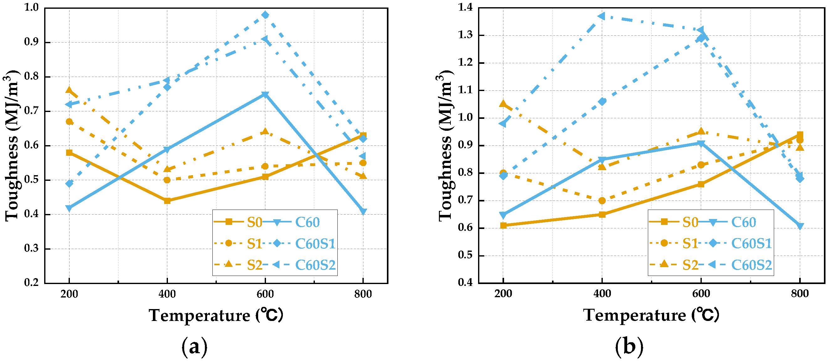 - Under the same steel fiber content, SFRCC demonstrates enhanced overall performance under high-temperature conditions. The fiber–matrix synergy in SFRCC enables the material to maintain a gradual failure mode at 800 °C, retaining approximately 40% of its residual strength. In contrast, SFRC experiences a rapid decline in performance after 600 °C, resulting in a significant increase in its degree of fragmentation.