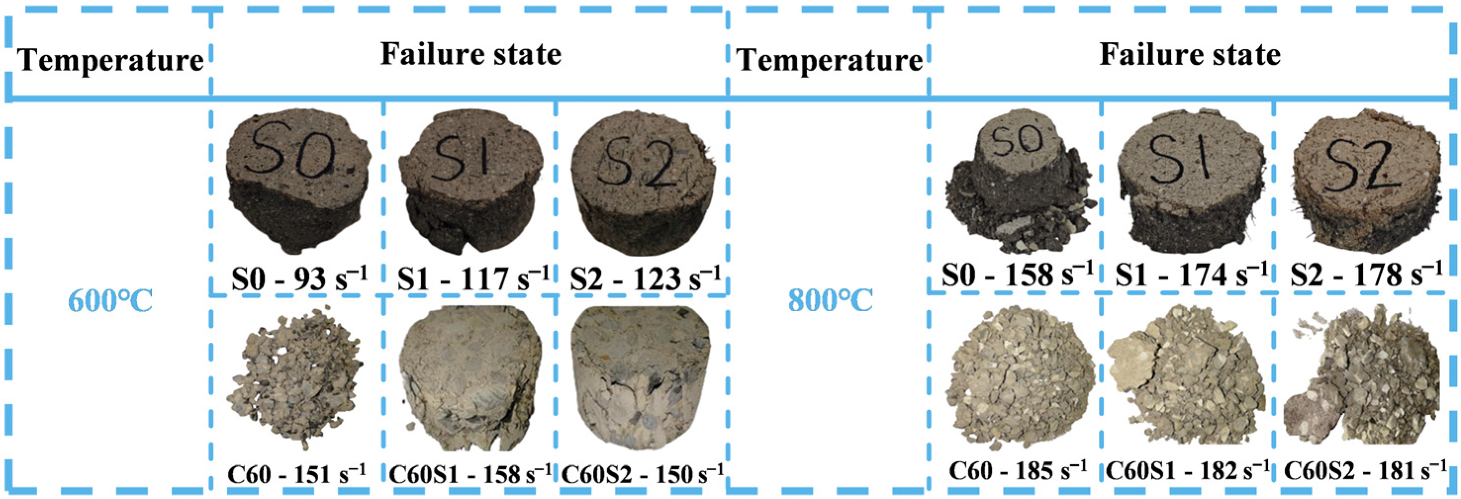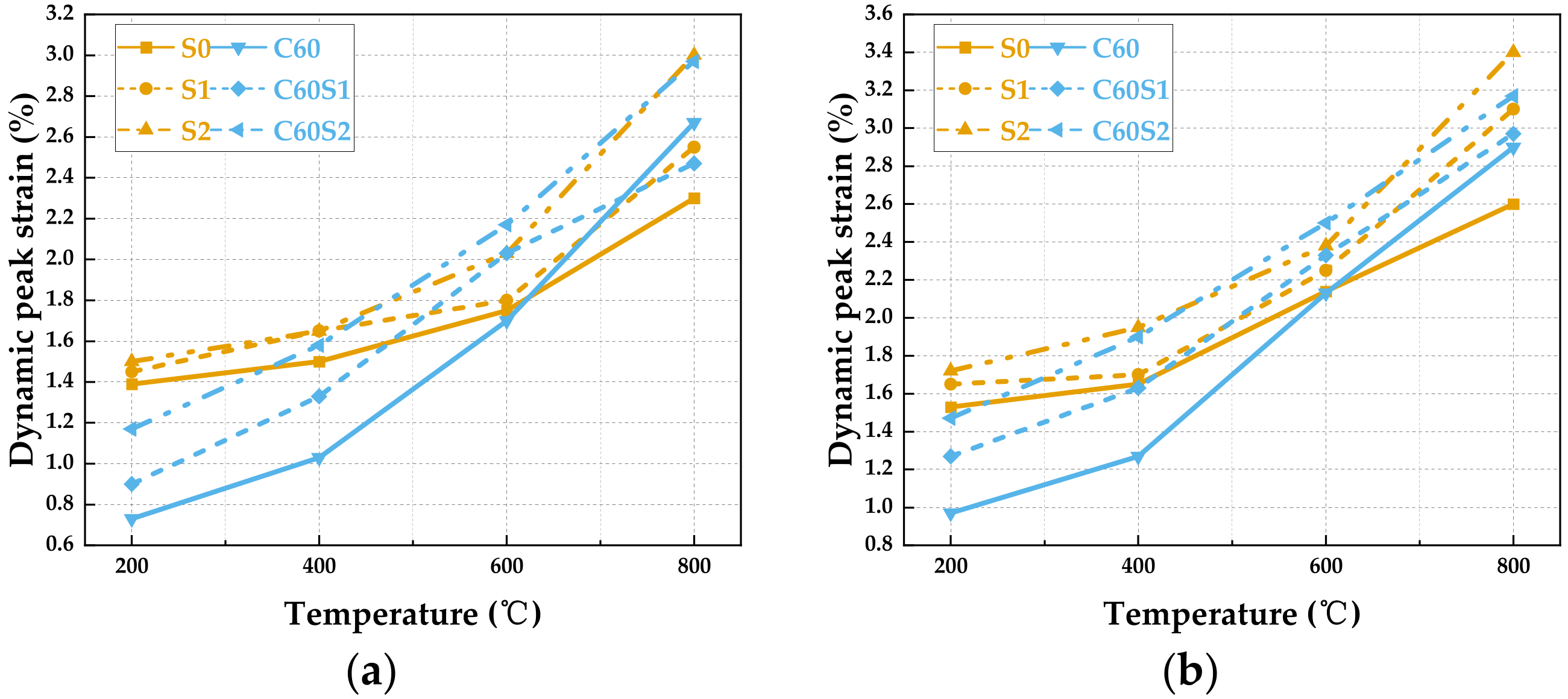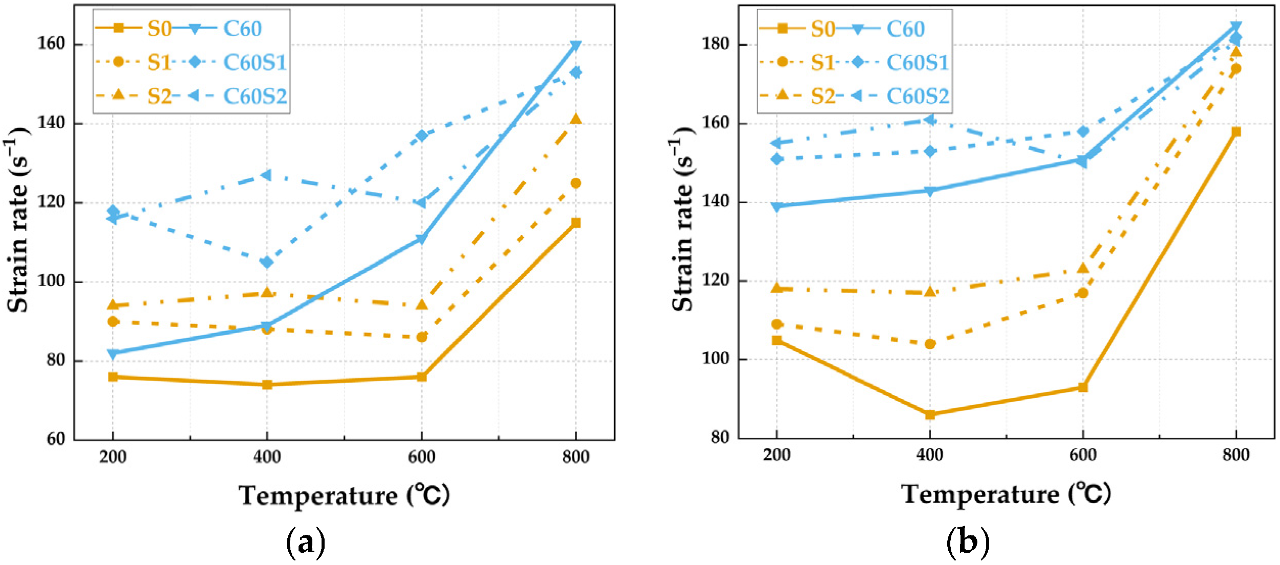 - Under high-temperature conditions, as the loading rate increased from 7 m/s to 8 m/s, the S2 specimens displayed a stable strain rate growth trend and, after 600 °C, maintained a damage mode predominantly characterized by fiber pull-out. In contrast, SFRC materials experienced rapid degradation of the matrix–fiber interface at elevated temperatures, resulting in a larger increase in strain rate, accompanied by performance fluctuations.