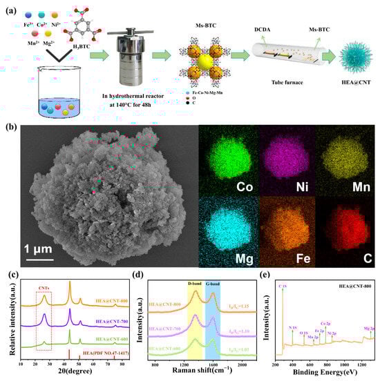 To characterize the samples, several analytical techniques were utilized. The crystal structure was identified by X-ray diffraction (XRD, Cu Kα radiation, Bruker D8 Advance, Mannheim, Germany). Microstructural and morphological observations were carried out using scanning electron microscopy (SEM, JEOL JSM-7800F, JEOL, Tokyo, Japan) and transmission electron microscopy (TEM, JEOL JEM-1400; HRTEM, JEOL JEM-2100F, JEOL, Tokyo, Japan). X-ray photoelectron spectroscopy (XPS, Thermo Scientific K-Alpha, Thermo Scientific, Waltham, MA, USA) served to analyze the surface elemental composition and chemical states. Furthermore, Raman spectroscopy (Renishaw inVia, 532 nm laser, London, UK) was applied to investigate the graphitization degree and defects of the carbon nanotubes. XRD analysis was conducted in a continuous scan mode with a step of 0.02° and a speed of 2°/min. For SEM observation, the powders were directly adhered to conductive carbon tape. For TEM analysis, the powders of HEA@CNT-600, HEA@CNT-700, HEA@CNT-800 and HEA@C-800 were ultrasonically dispersed in ethanol and dropped onto carbon-coated copper grids.